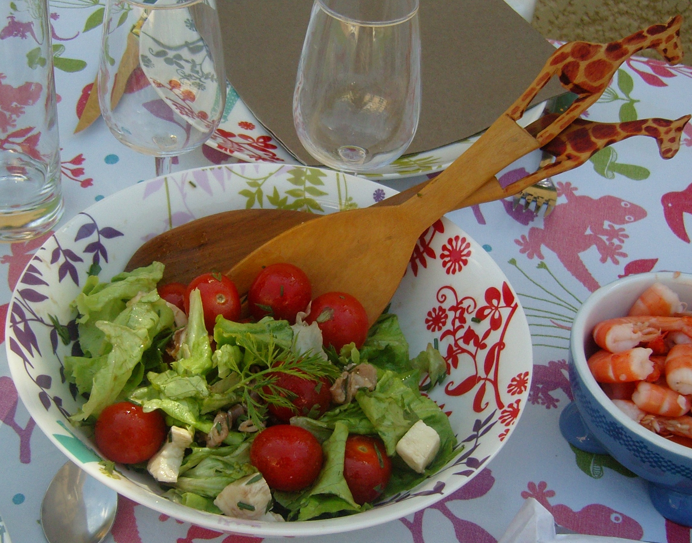 De la laitue, des champignons de paris, des tomates cerises (en saison), des fanes ciselées. Vous pouvez ajouter à l'envie d'autres herbes tels que du persil et de la ciboulette. Une vinaigrette pour ma part à base de vinaigre balsamique, huile d'olive et échalottes assaisonne le tout.