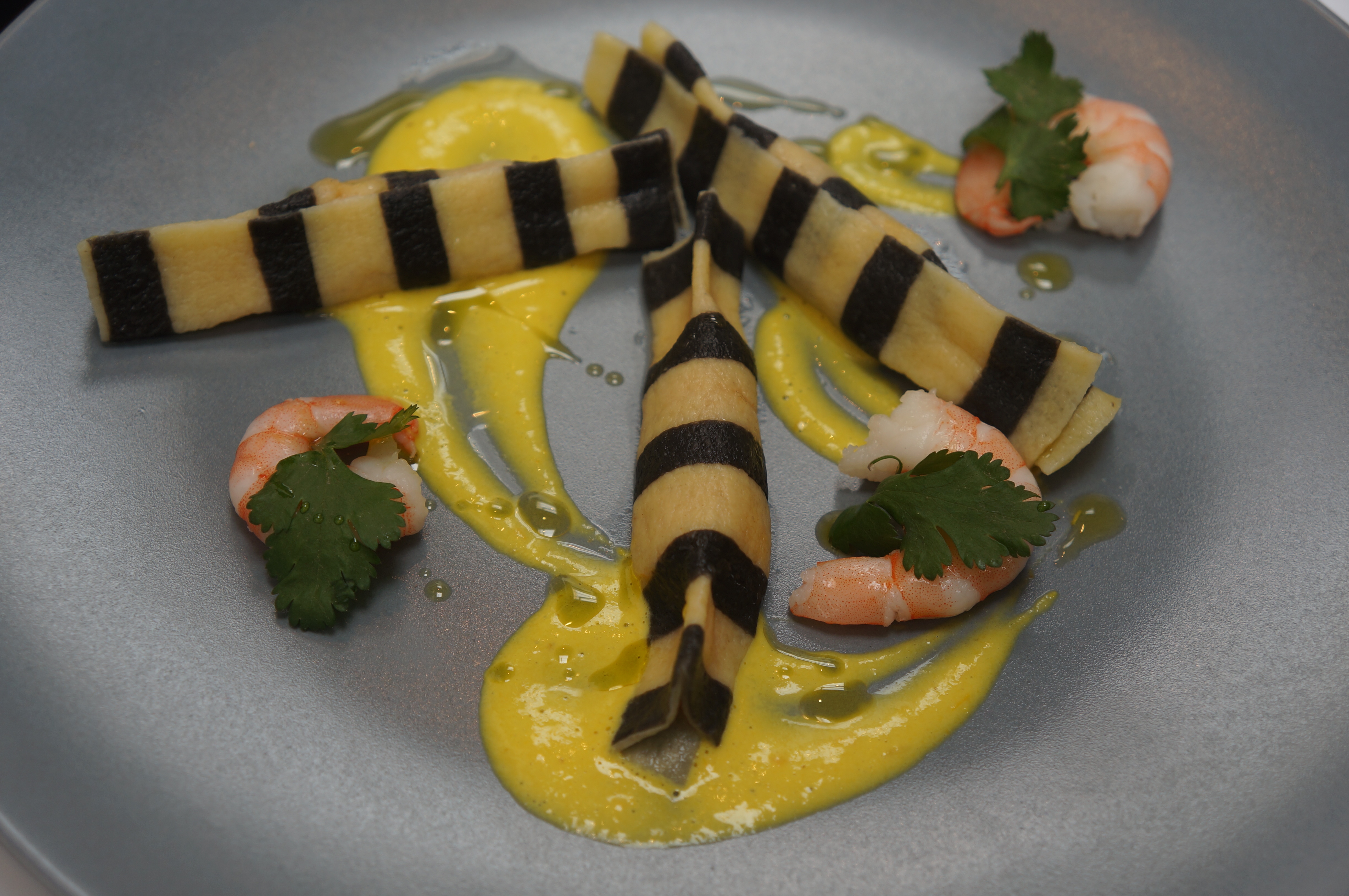 Après l’apéritif passons au plat. Voici les bonbons aux crevettes et zestes de pomelo parfumé au ras el hanout réalisé sur site par le chef Thierry Molinengo sur le stand Kenwood. En plus, d’être beau c’est bon.