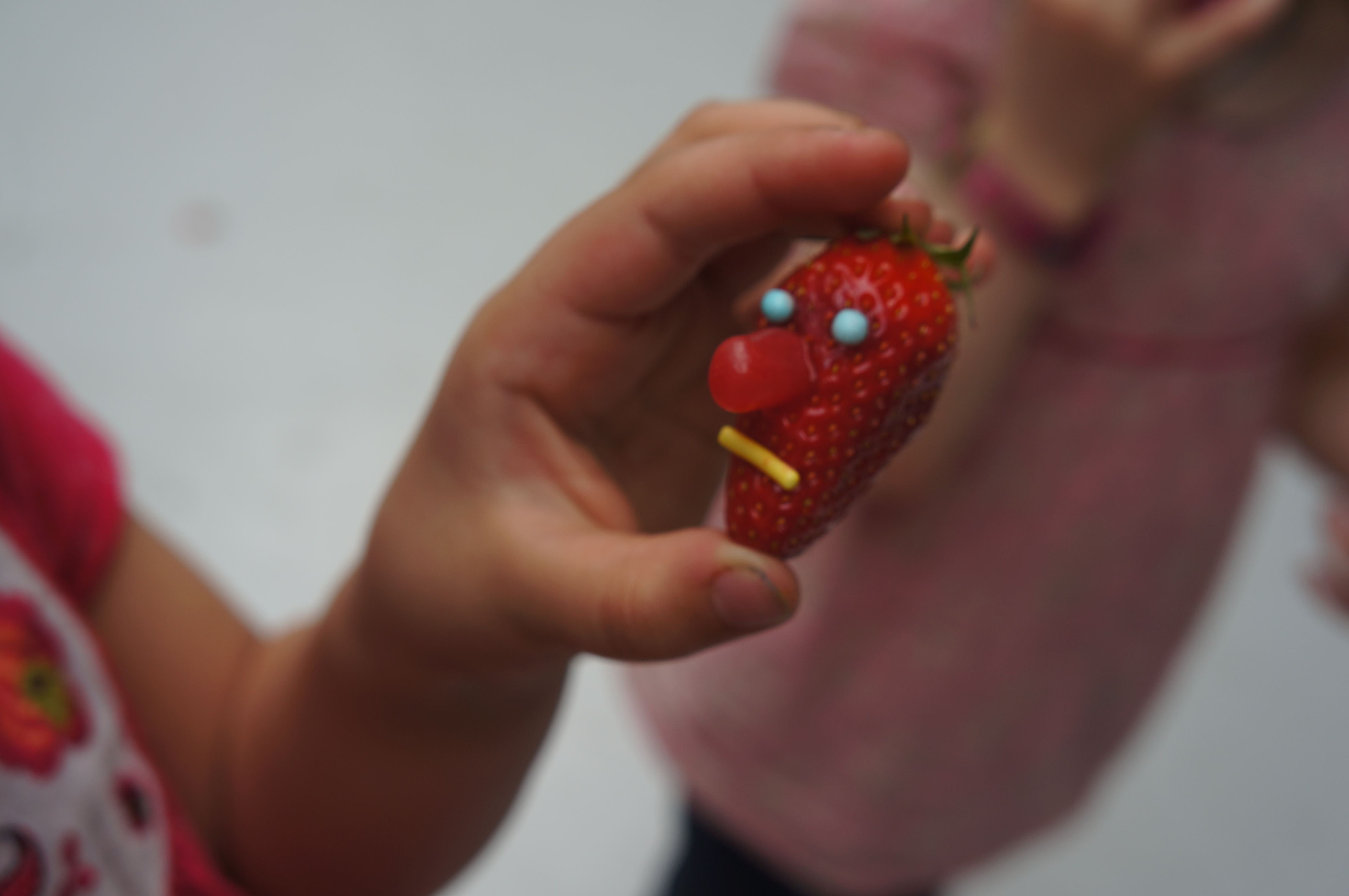 Pour le dessert ? Vous pouvez déguster de belles fraises sculptées. Vous pouvez admirer ici l’oeuvre de Gabrielle qui n’était pas peu fière.