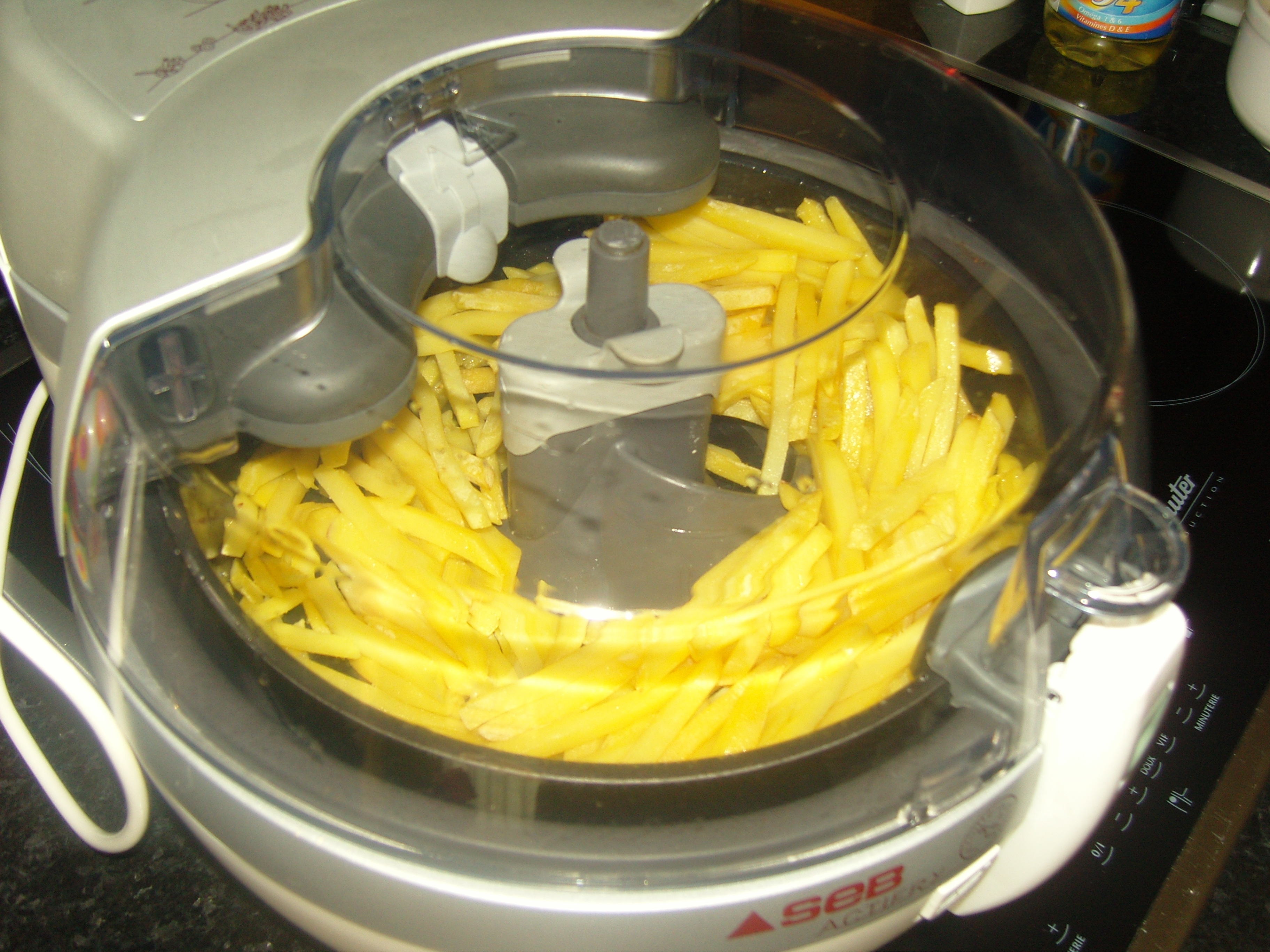 Un jour, une amie m’a dit être très satisfaite de la Seb Actifry. Après test avec sa friteuse je me suis décidée à investir. En effet, les frites en plus d’être bonnes ne sont pas grasses au toucher et sont effectivement faîtes avec peu d’huile une cuillère à café ou deux selon la quantité de frites. Tout le monde les apprécie à la maison. Avec le temps j’ai un peu affiné la méthode pour réduire le travail de préparation et disposer de frites croustillantes au bon moment !