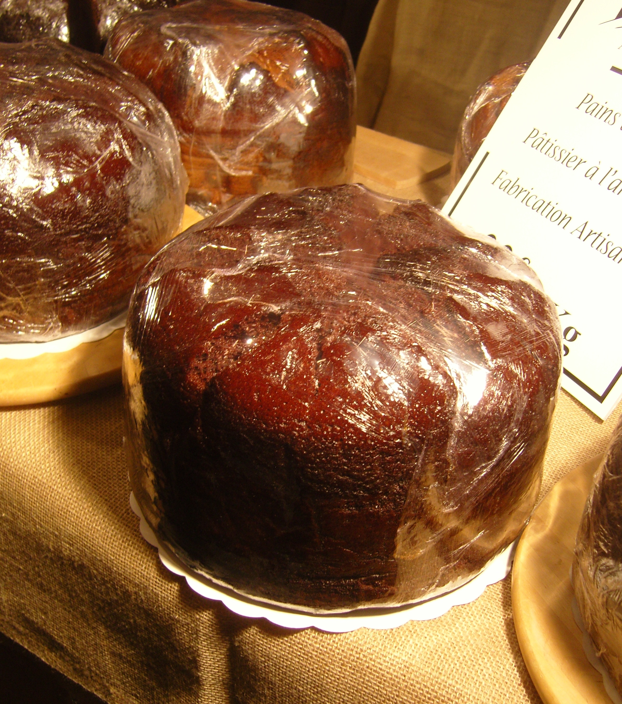 Le plus gros pain d'épices que jamais vu,  ici au chocolat. L'artisan est d'Aix en Provence et s'appelle Nicolas. J'ai appris une chose. Cela se conserve au frigo emballé dans du film alimentaire.   Pain d epice au chocolat