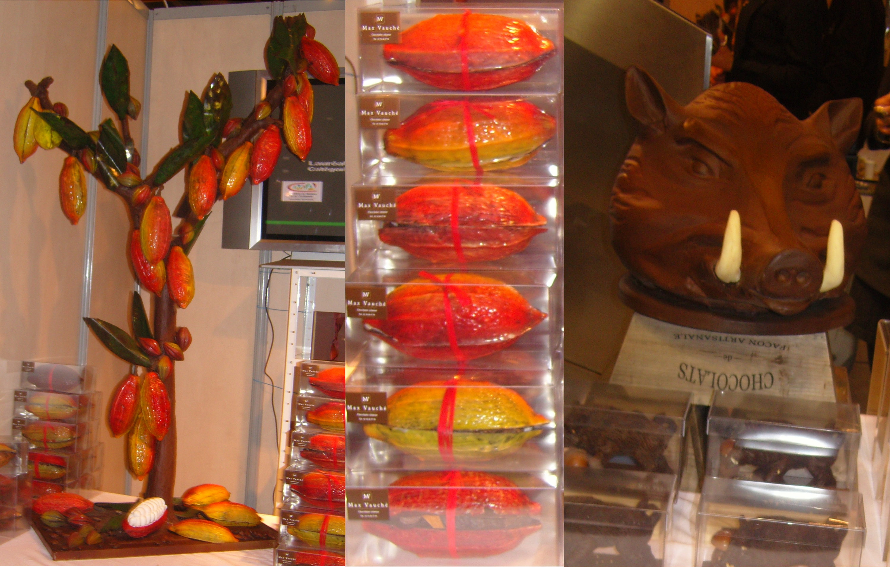 Max Vaucher un chocolatier solognot a réalisé un superbe cacaoyer, des cabosses fourrées et une tête de sanglier. J'ai dit qu'il venait de Sologne 🙂Max Vaucher Cacaoyer en chocolat  cabosses fourées têtes de sanglier