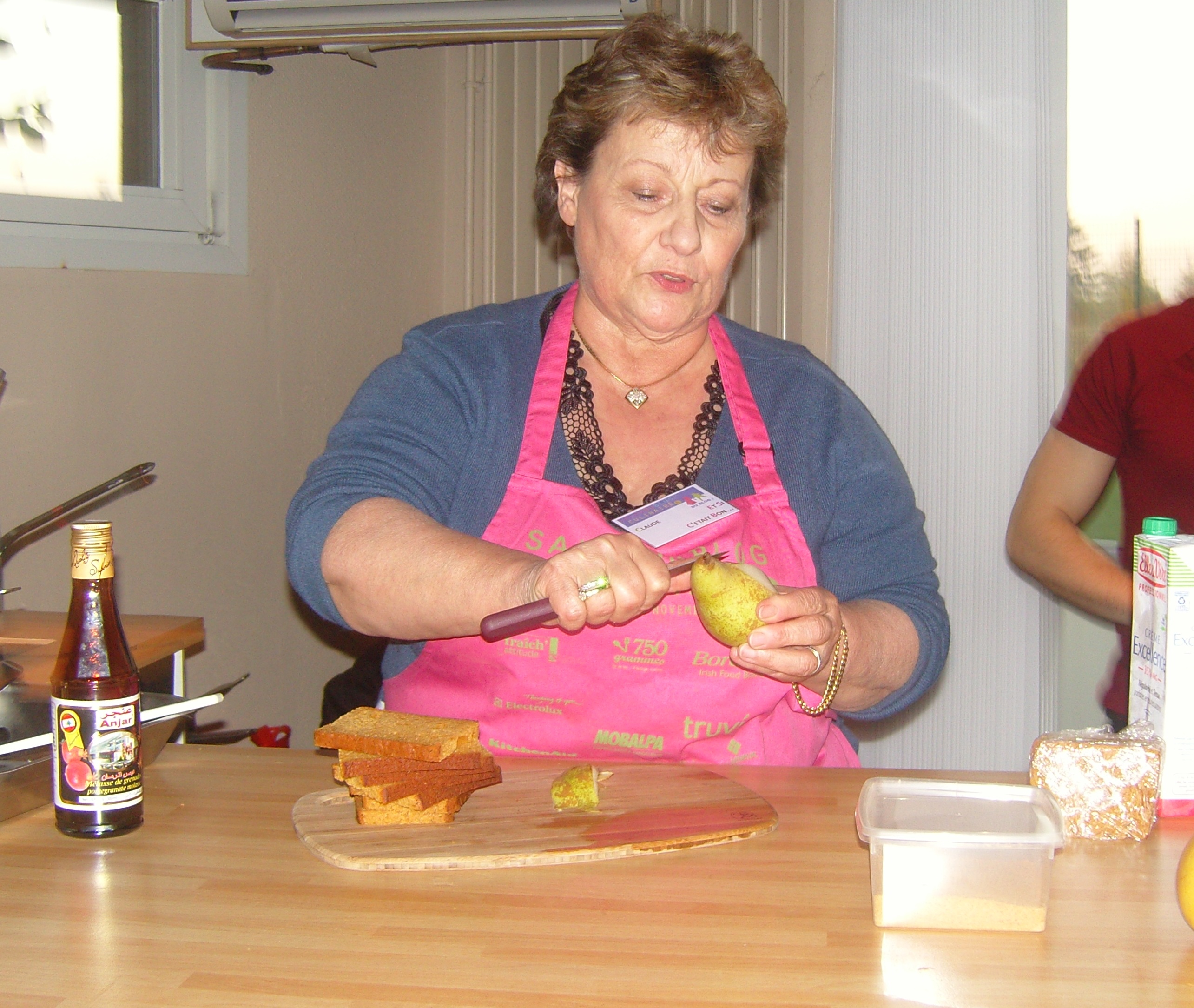 Un moment d'émotion fort sympathique qui résume bien l'ambiance du salon. Mamina sur le stand Fraich'Attitude ou les défenseurs des fruits et légumes frais nous a préparé une poire pochée au vin doux et à la mélasse de grenade, fourée au gorgonzola et panée au pain d'épice. une création très gourmande. Mamina nous a confié d'ailleurs avoir découvert la mélasse de grenade grâce à la blogosphère.