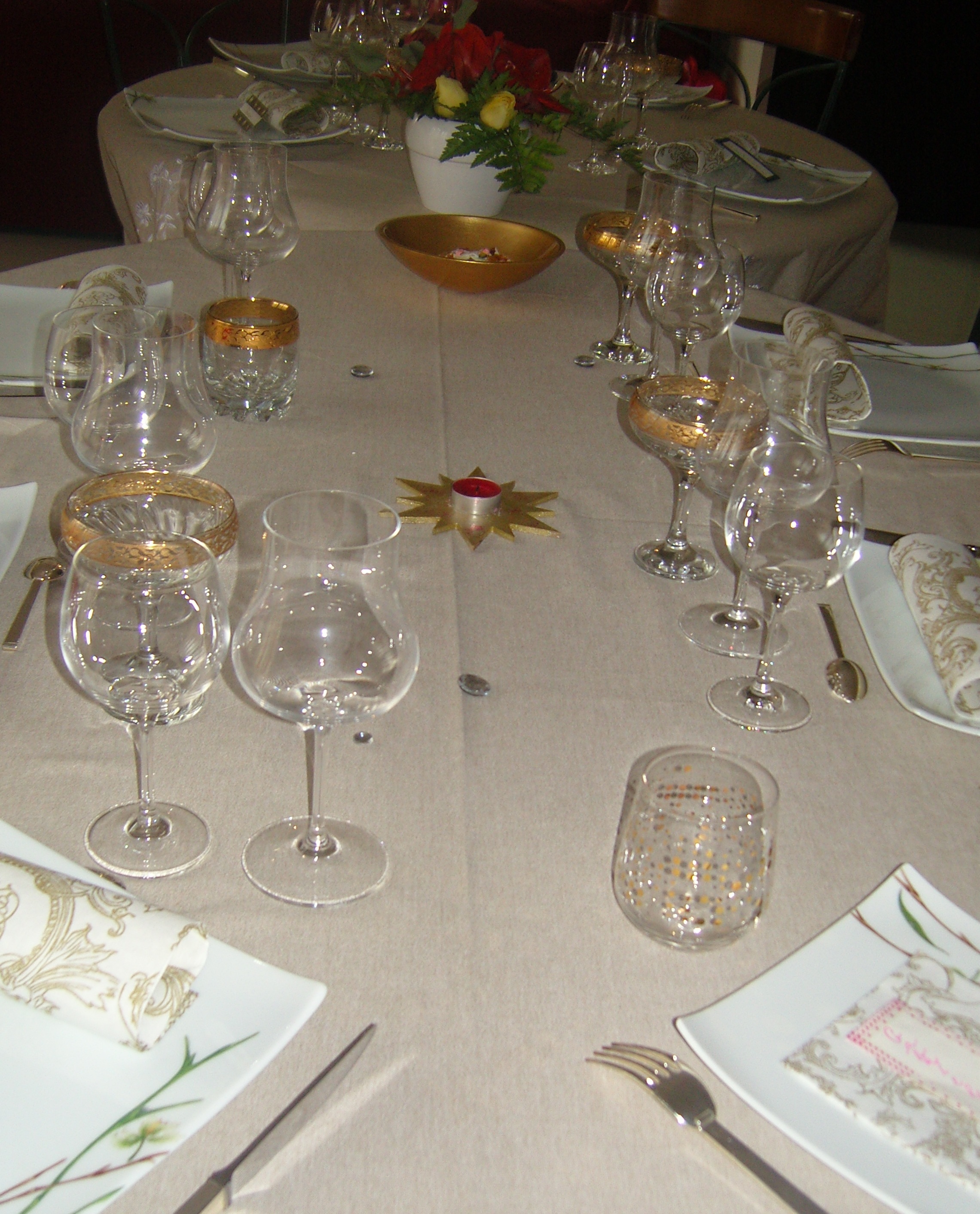 Enfin, petite création personnelle les convives ont leur porte nom personalisé au couleur or sur la thématique de Noël. Merci Masking Tape. J'avais cette bande pour décorer des paquets mais elle fait aussi de très jolis porte-noms. Déco Or - Porte NomsDes objets peu usités dans nos placards, les créations de nos enfants, quelques emplettes et notre créativité personelle sont les secrets de cette présentation que je partage avec vous aujourd'hui. J'espère que cela vous a plu.