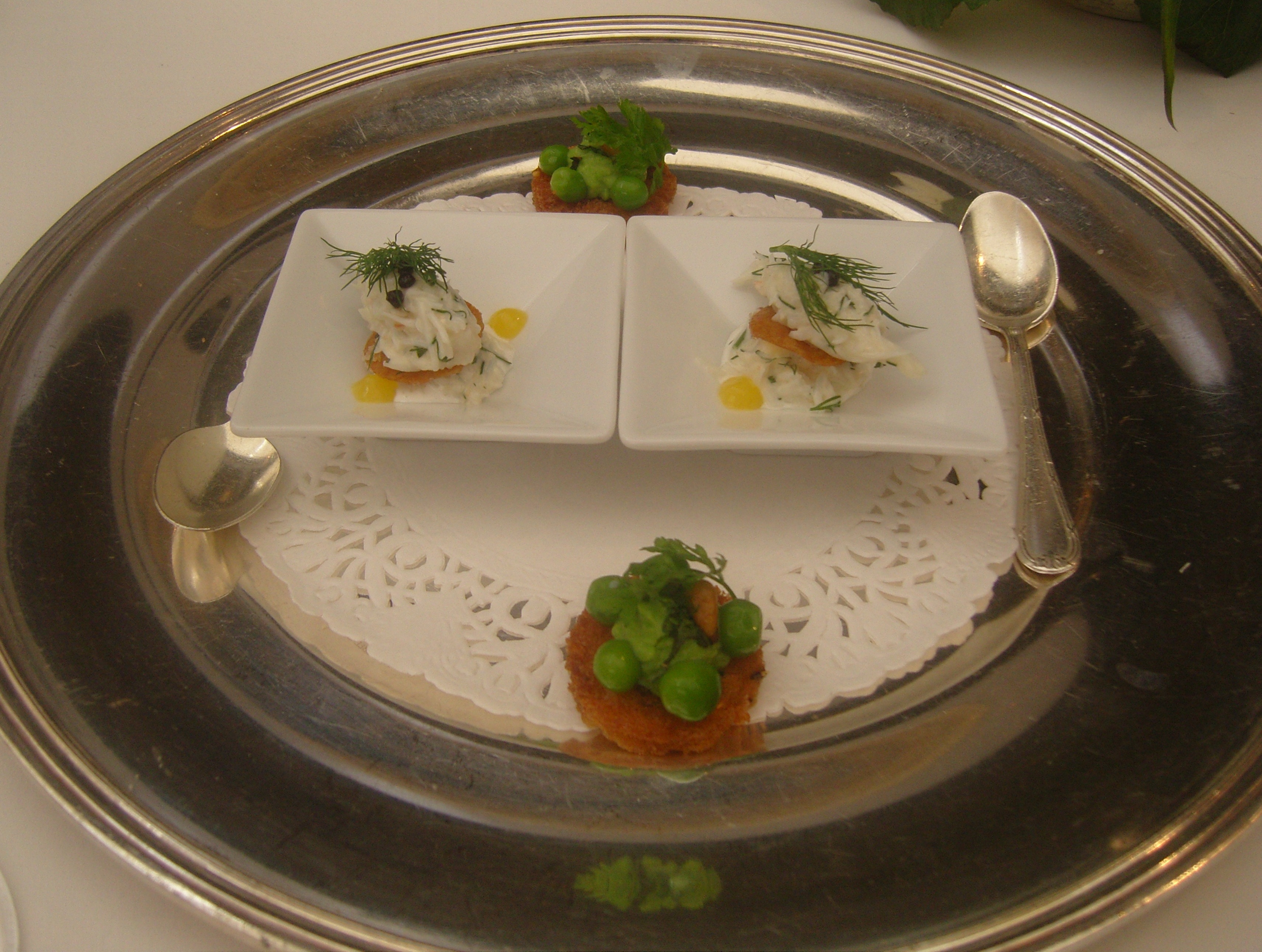 L’apéritif maison Vouvray pétillant, pêche de vigne et grand marnier est accompagné d’une délice de  tourteau et de toasts aux petits pois. Charles Barrier Mise en Bouche