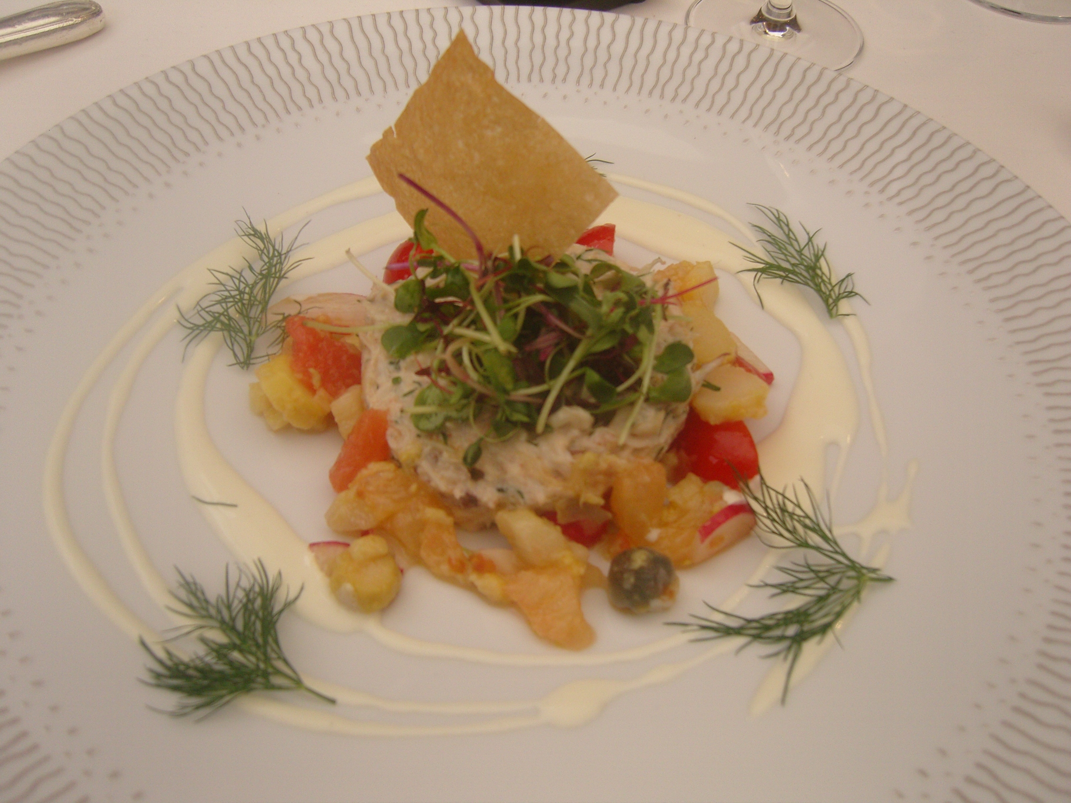 L’entrée choisie une fraîcheur de tourteau et d’araignée de mer arrivés le matin même. Asperges; tomates cerises, radis … accompagne les crustacés. Charles Barrier Fraicheur de Tourteau