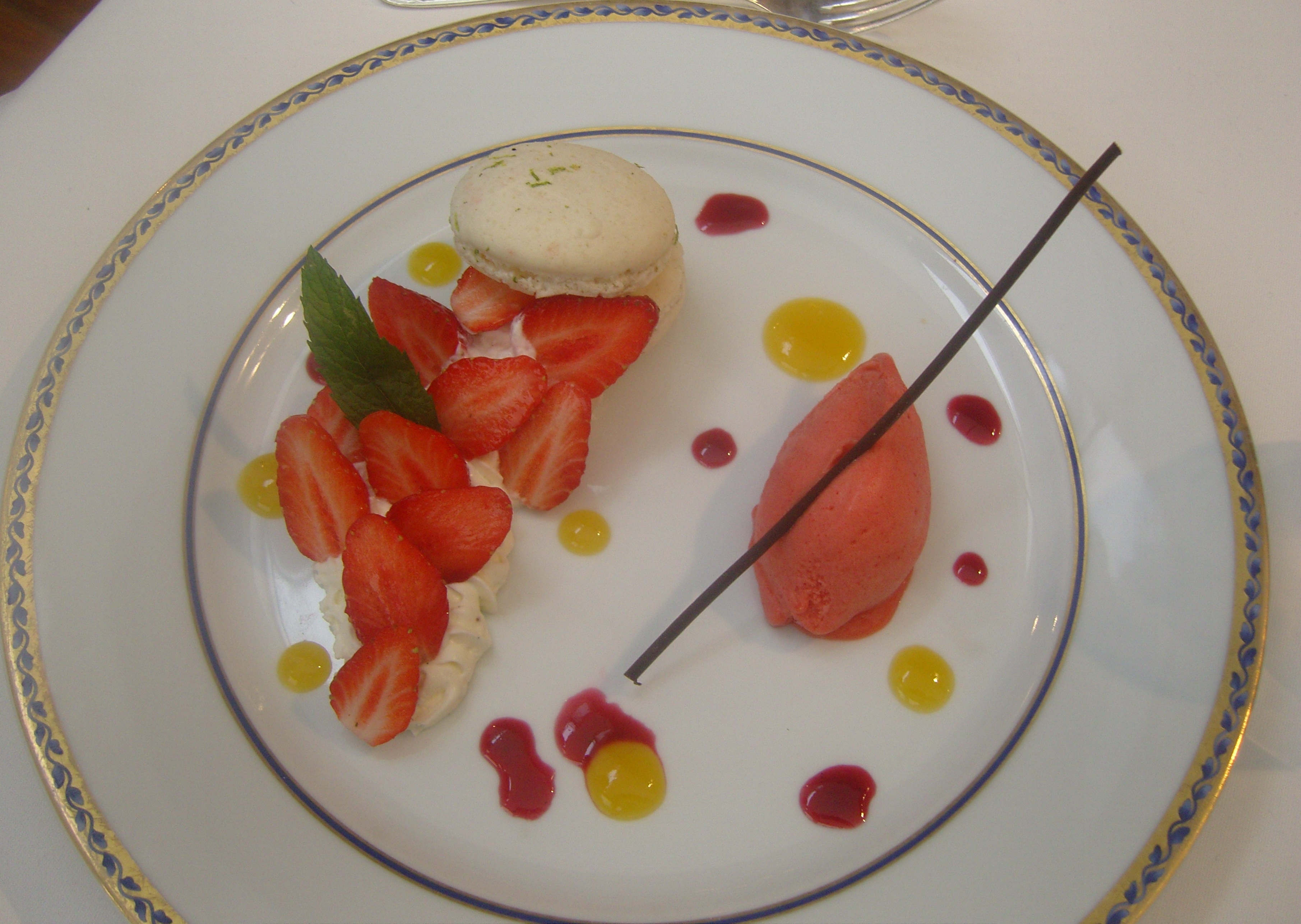 Macaron verveine vanille fraise avec son sorbet à la fraise en dessert. Magnifique. Le sorbet très crémeux est en délice. Charles Barrier Dessert