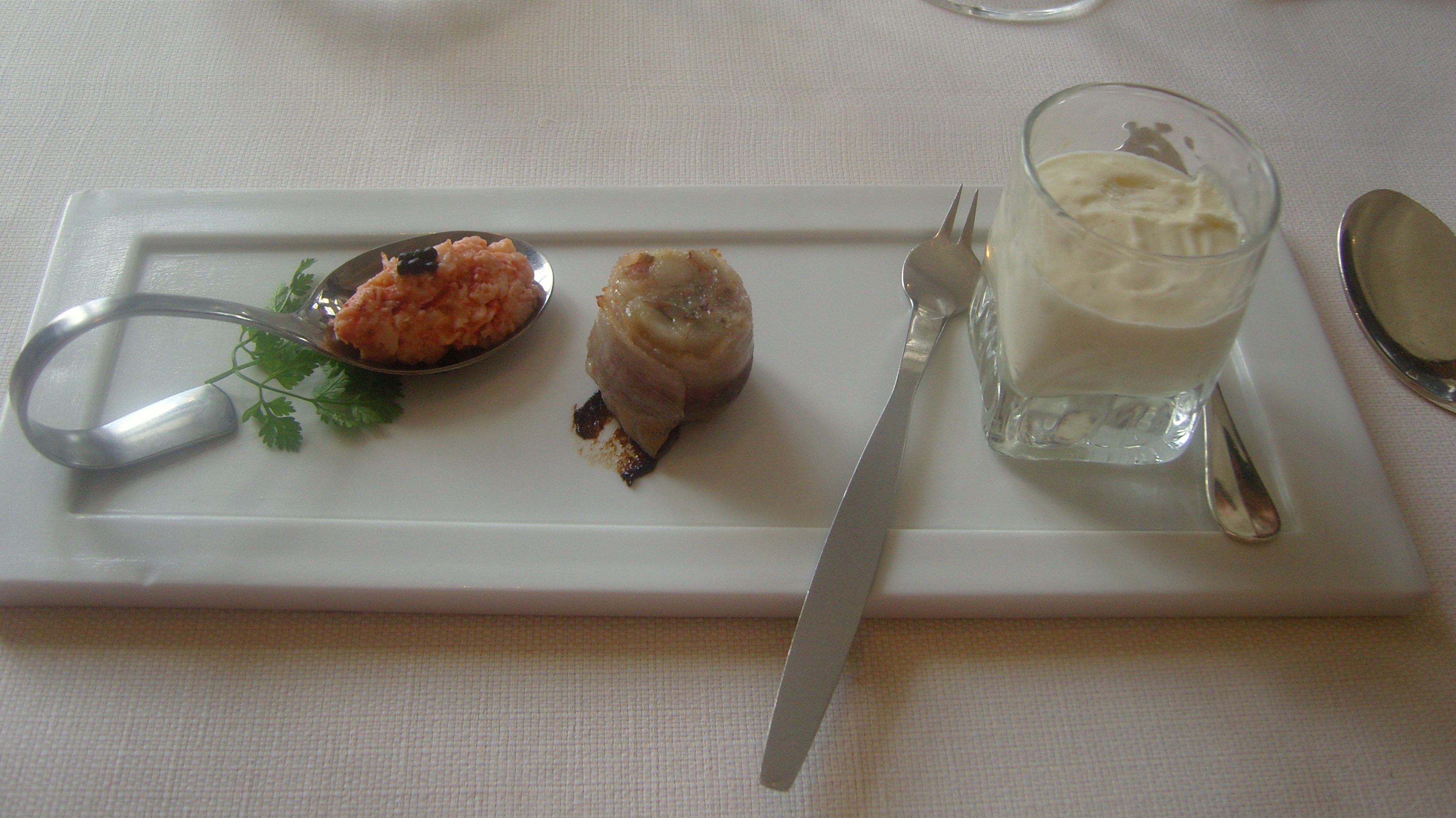 La mise en bouche est pleine d'originalité. Une crème de chou fleur onctueuse et délicieuse. Cela m'a donné envie d'en réaliser. Un champignon farçi au pied de cochon et lardé et un éminçé de Homard.
