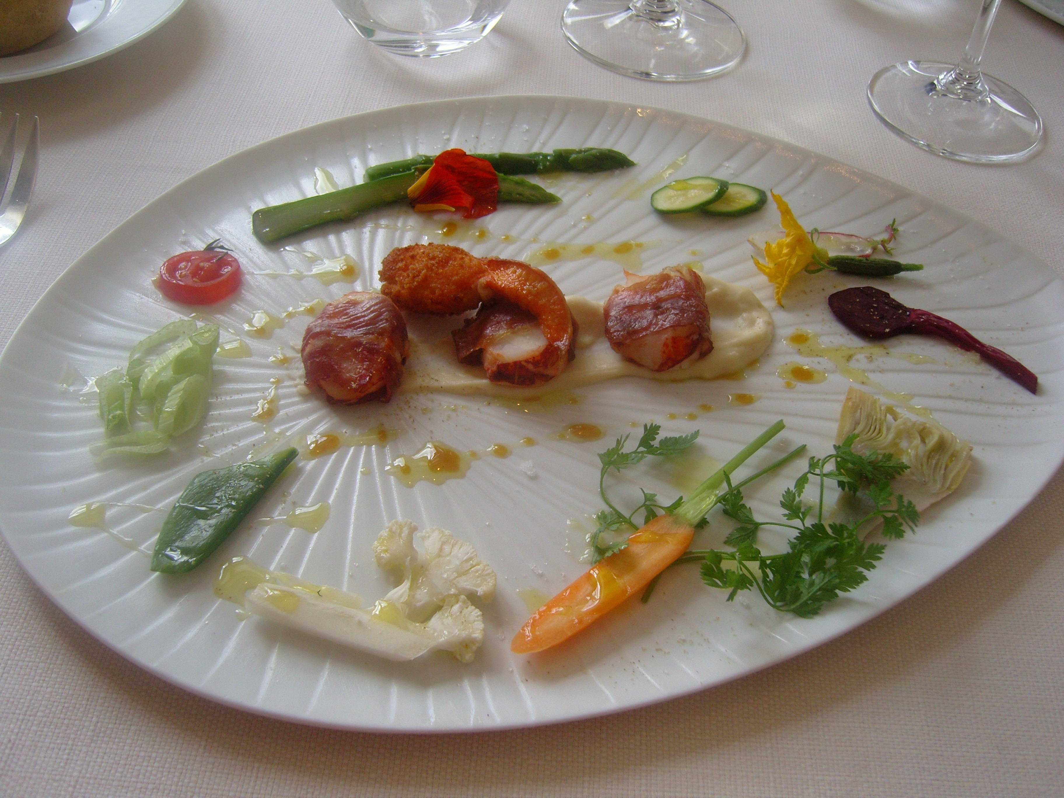 Pour l'entrée, le plat et le dessert nous avons suivi les suggestions du chef. Des bonbons de Homard bleu au jambon serrano et ses petits légumes. L'assiette est magnifique et les légumes variés.