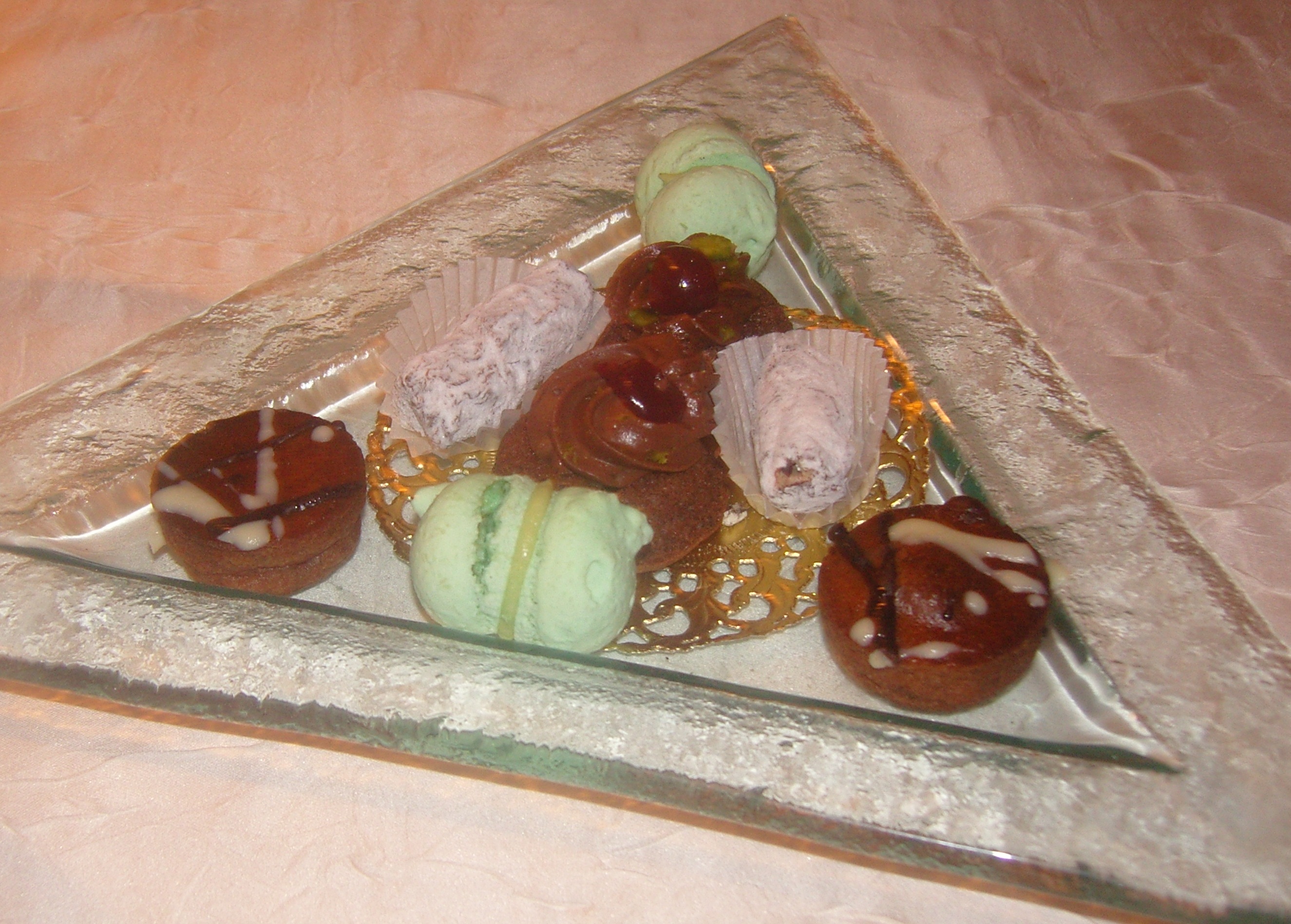 Les mignardises sont extrêmement goûteuses. Mini macarons à la pitache, gâteau au chocolat/griottes …