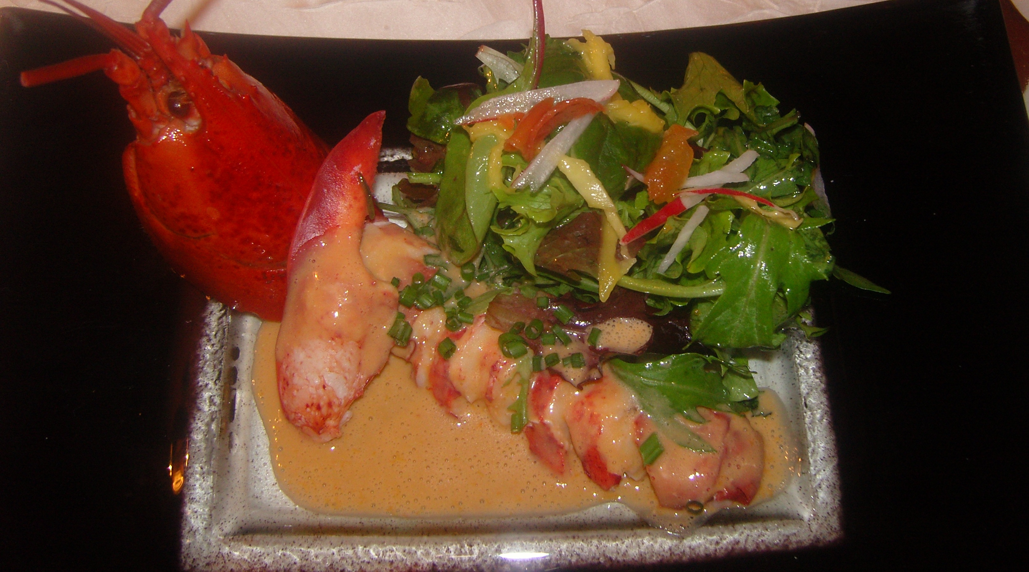 En entrée une fraîcheur de Homard avec un mesclun à la mangue. L'assaisonement à la mangue est une merveille. Cette salade j'aurais pu en faire tout mon dîner.
