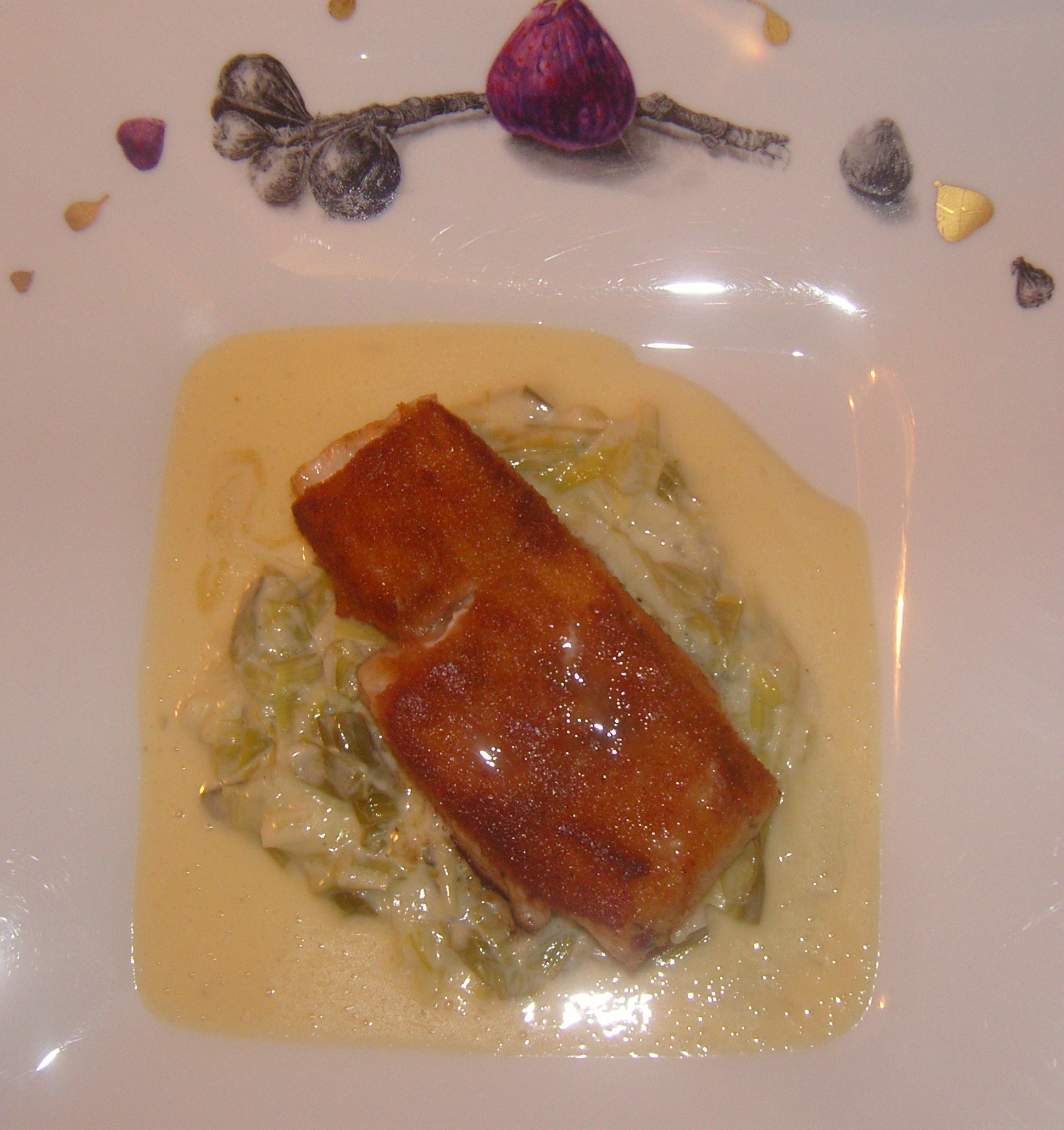 Le Pavé de Sandre avec sa croute de pain d'épices servi avec sa fondue de poireau liée au beurre blanc est un délice. Vos sens sens sont sollicités à plusieurs niveaux visuellement, gustativement certes mais votre sens olfactif également. Lorsqu'ils soulèvent la cloche vous admirez progressivement votre plat et les effluves vous chatouillent les narines développant votre appétit. Un classique de la maison et l'on comprend pourquoi.