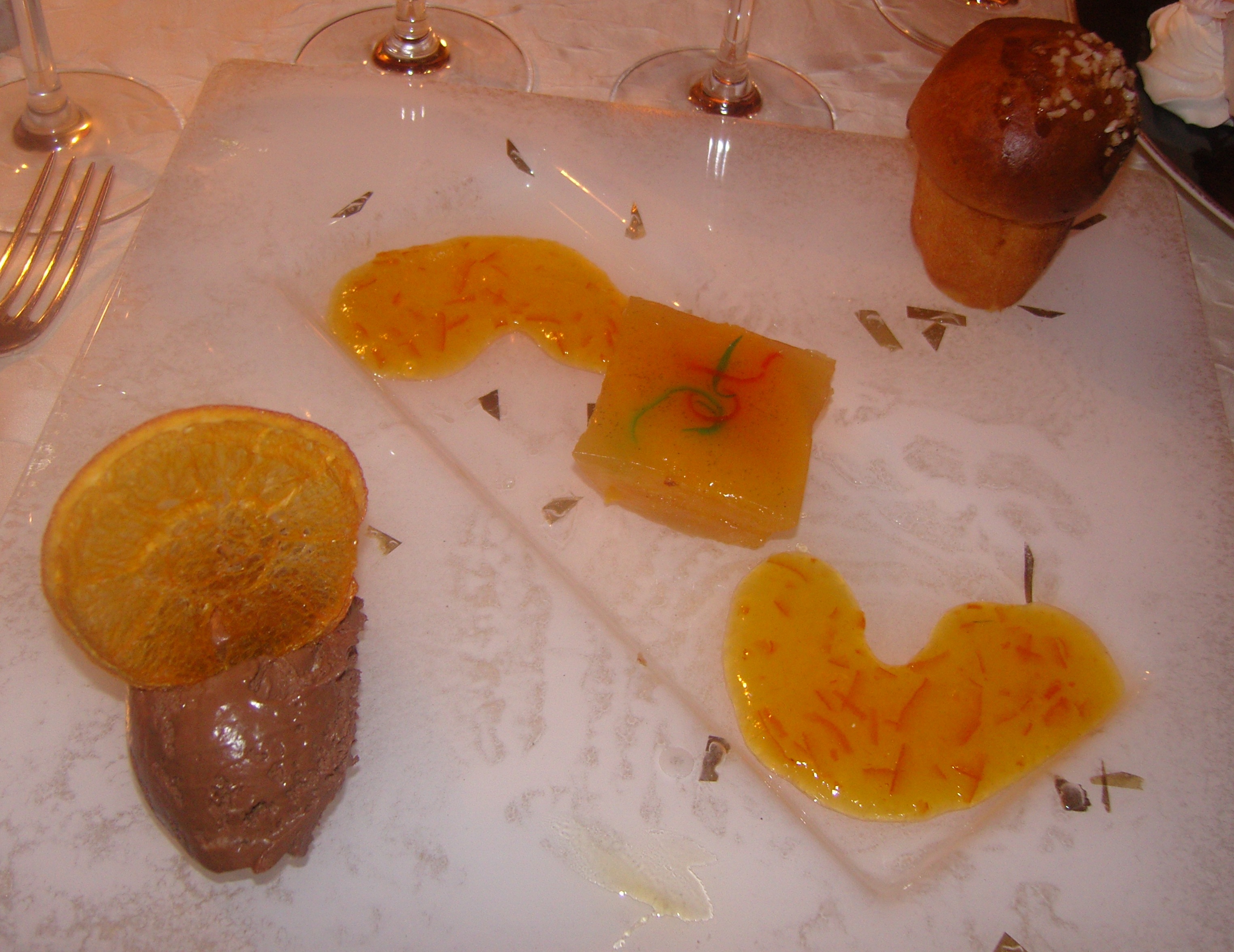 Le chef travaille avec le chocolat Valrhona que j'affectionne particulièrement. Mon dessert se compose d'un pressé d'orange, d'une quenelle de mousse au chocolat Tainari et une brioche maison.