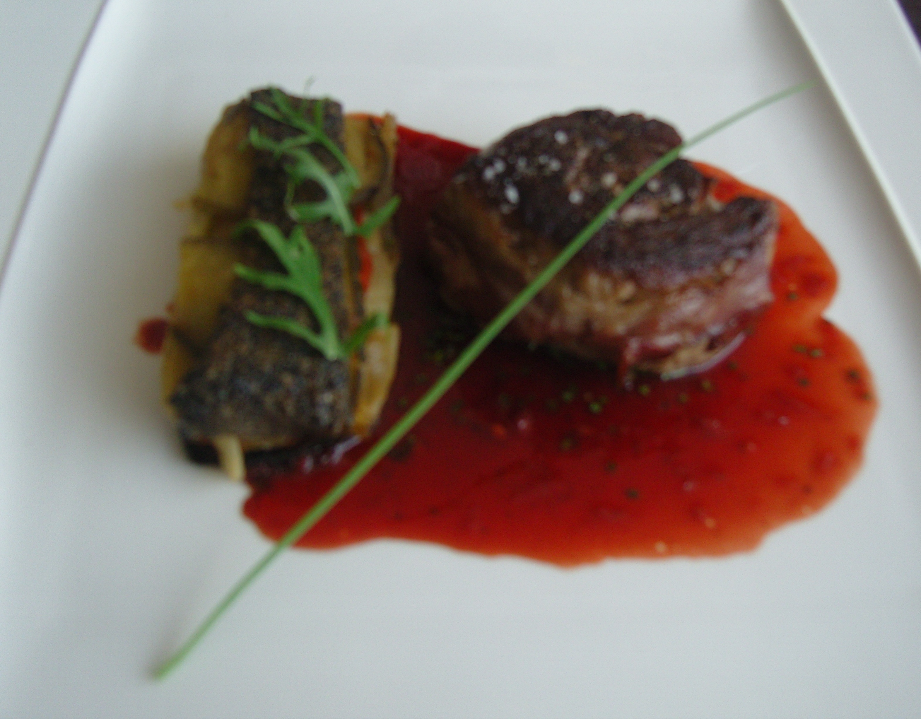 L’Epicurien « Tournedos » d’onglet de veau au lard fumé, fondue d’échalotes au jus aigrelet de betterave. Confit de légumes sous une fine croûte aux olives