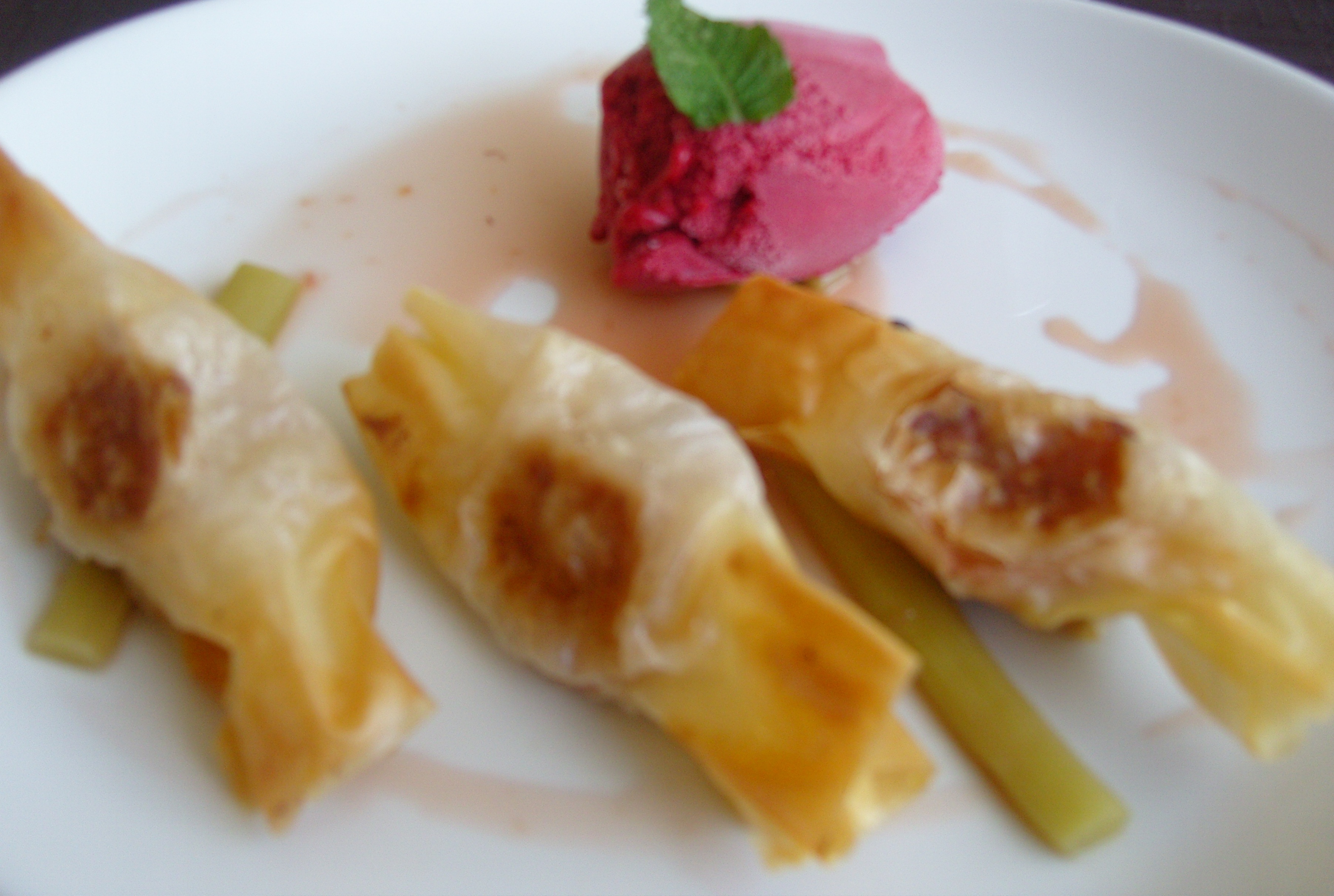 L’Epicurien – Bonbons croustillants de pêche rôtie à la verveine sur tronçons de rhubarbe pochée. Sorbet groseille