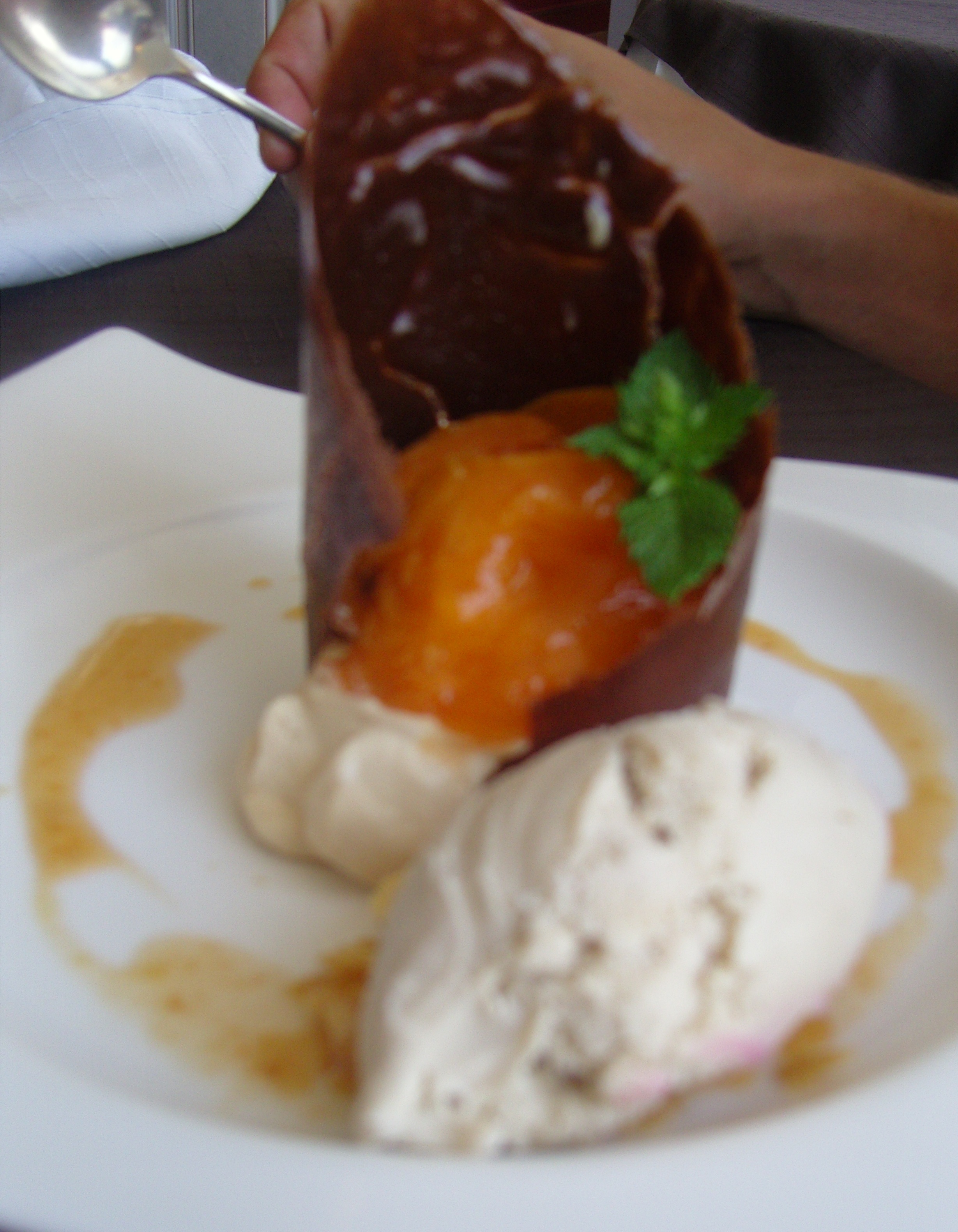 L’Epicurien Fuseaux croquants d’abricots pochés, crème caramel-romarin au mascarpone. Glace fève de Tonka
