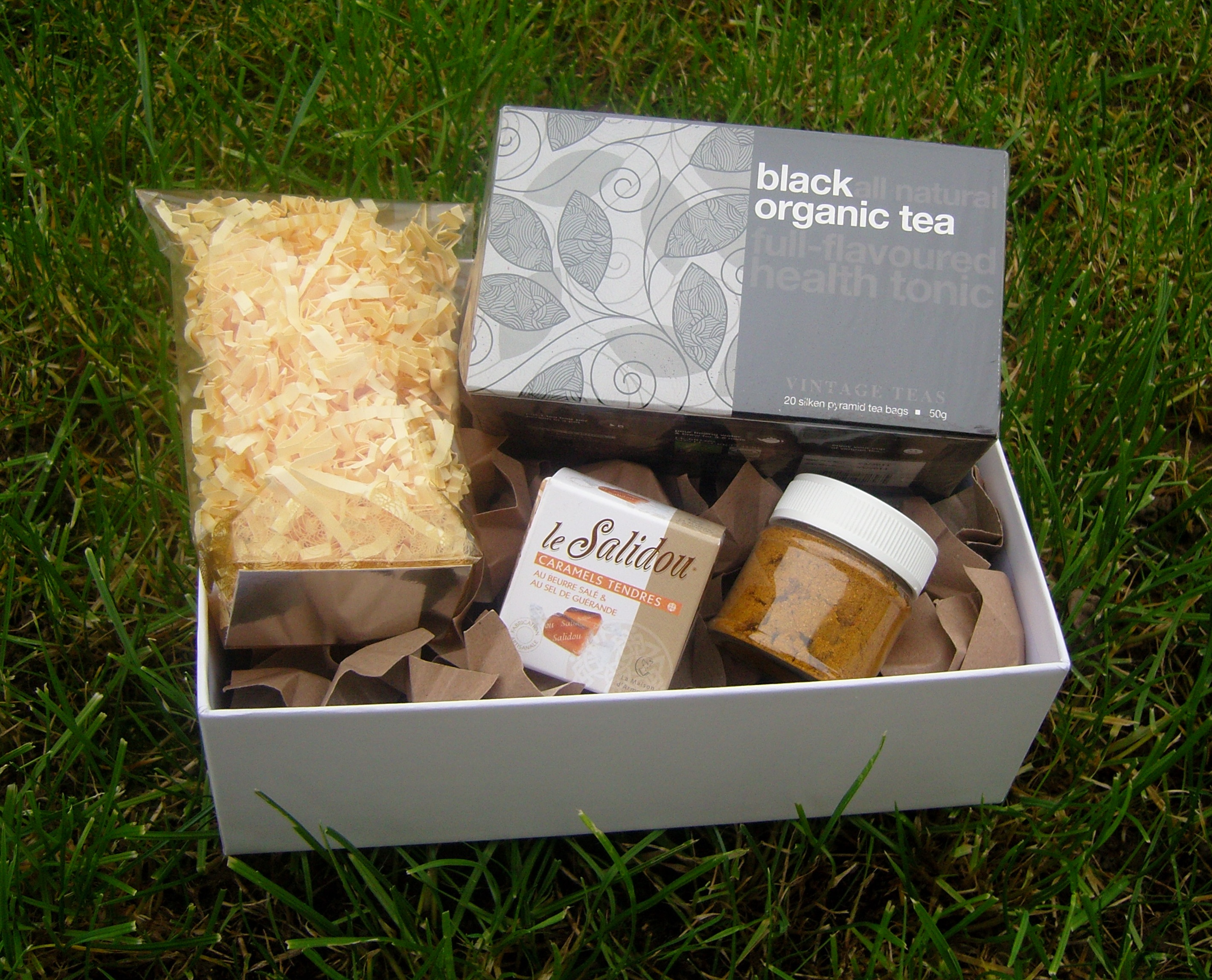 Dans chacune des boîtes du thé bio, des épices, des caramels mous au beurre salé et une surprise 🙂 A la place du sachet des frisottis. Il y aura de petites choses à manger de ma composition.
