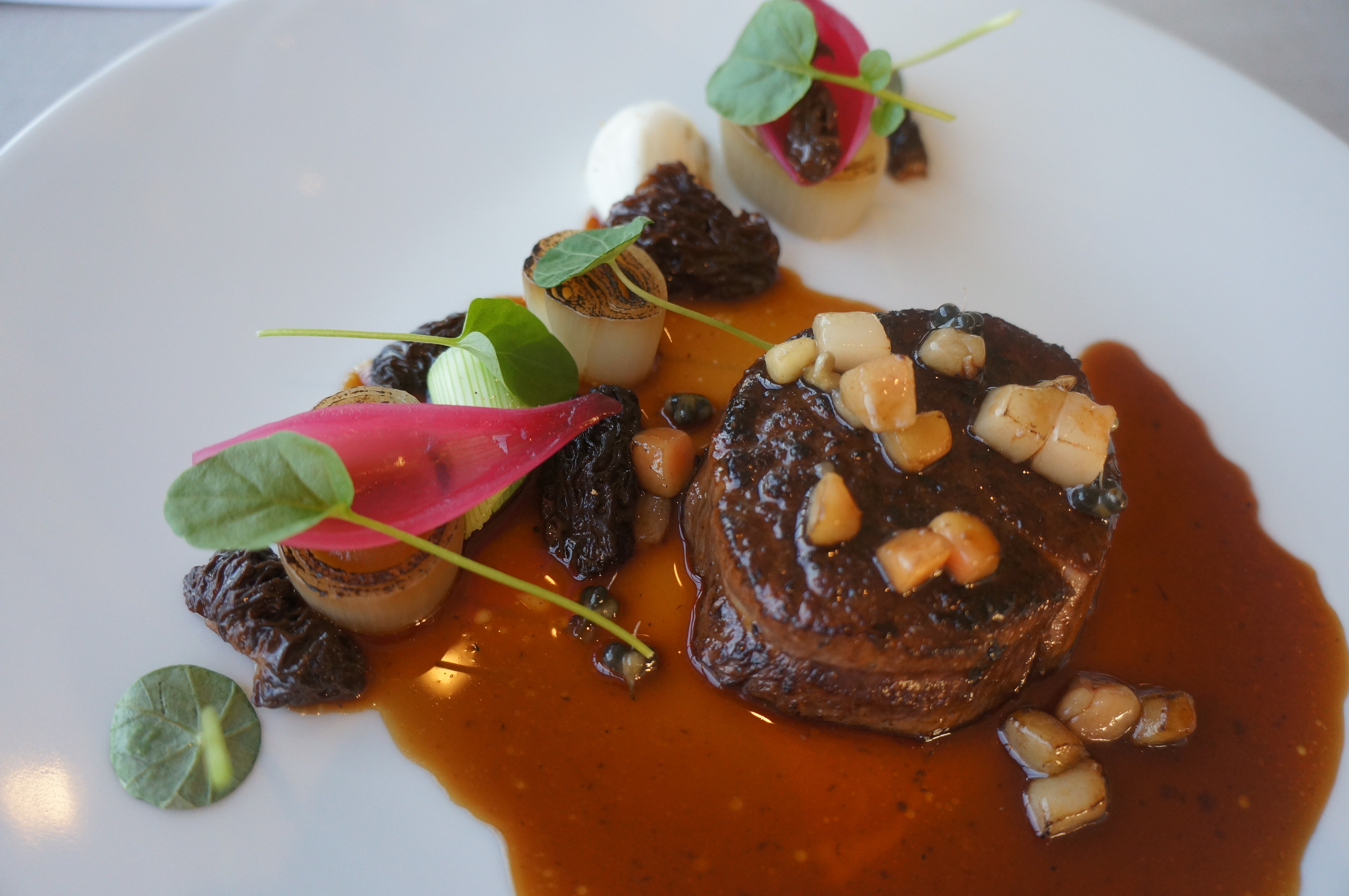 Il est gentimment venu me présenter ses plats plusieurs fois. Il est très créatif c'est un amoureux des produits qu'il cherche à sublimer. Il était un peu désolé car en ce moment la nature commençe à s'éveiller et il y a moins de choix. Sa cuisine et son équipe sont d'un calme olympien. On sent l'énorme travail de préparation avant le service. Les assiettes sont méticuleusement préparées avec soin et à la pince à épiler. Toutes les assiettes sont un poème. Ce tournedos de boeuf danois fondant avec des légumes juste cuits légèrement croquant est un pur plaisir.