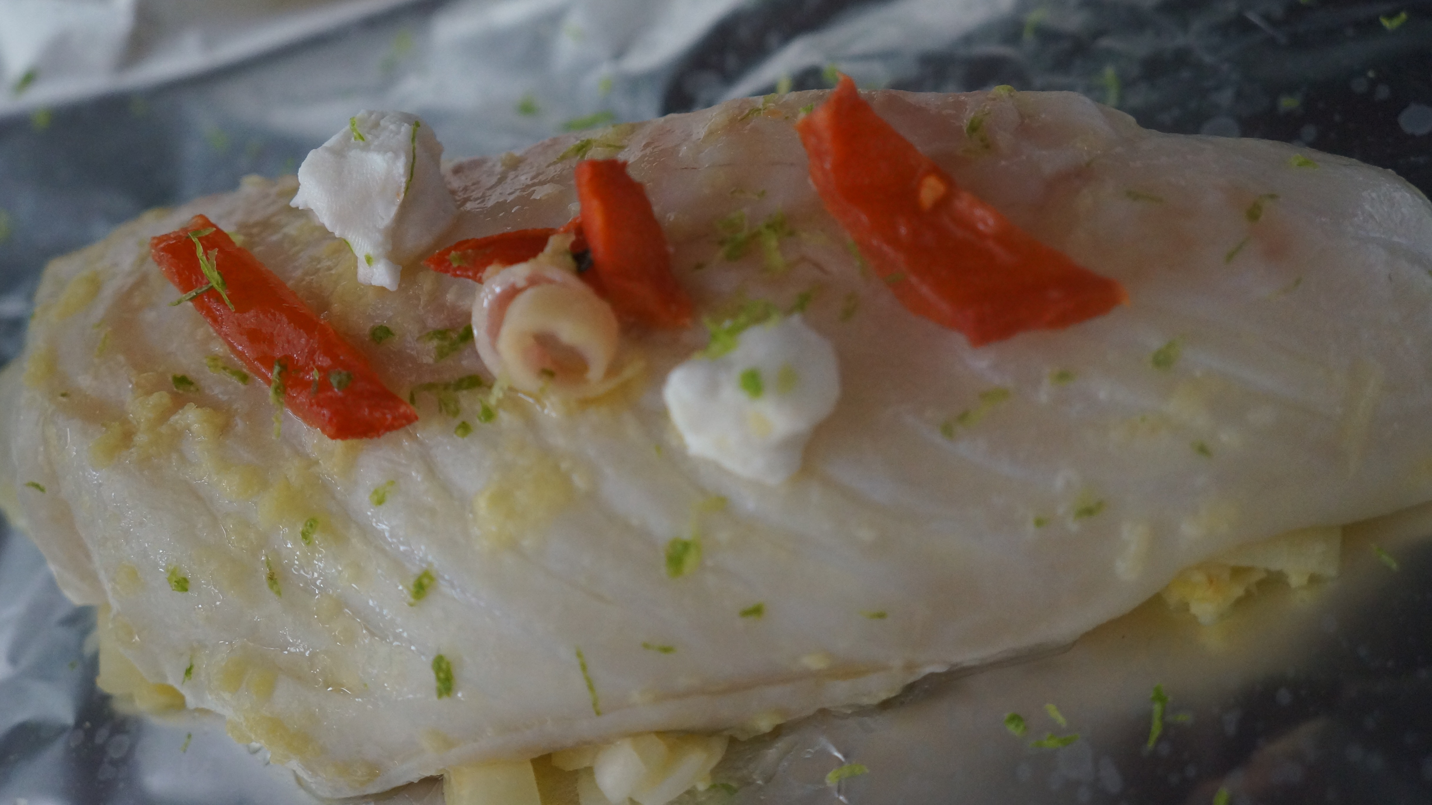 - Parsemez de tomates confites émincées, de zestes de citron vert et si vous avez ajoutez un peu de coriandre ainsi qu’une cuillère à soupe de lait de coco par papilotte.