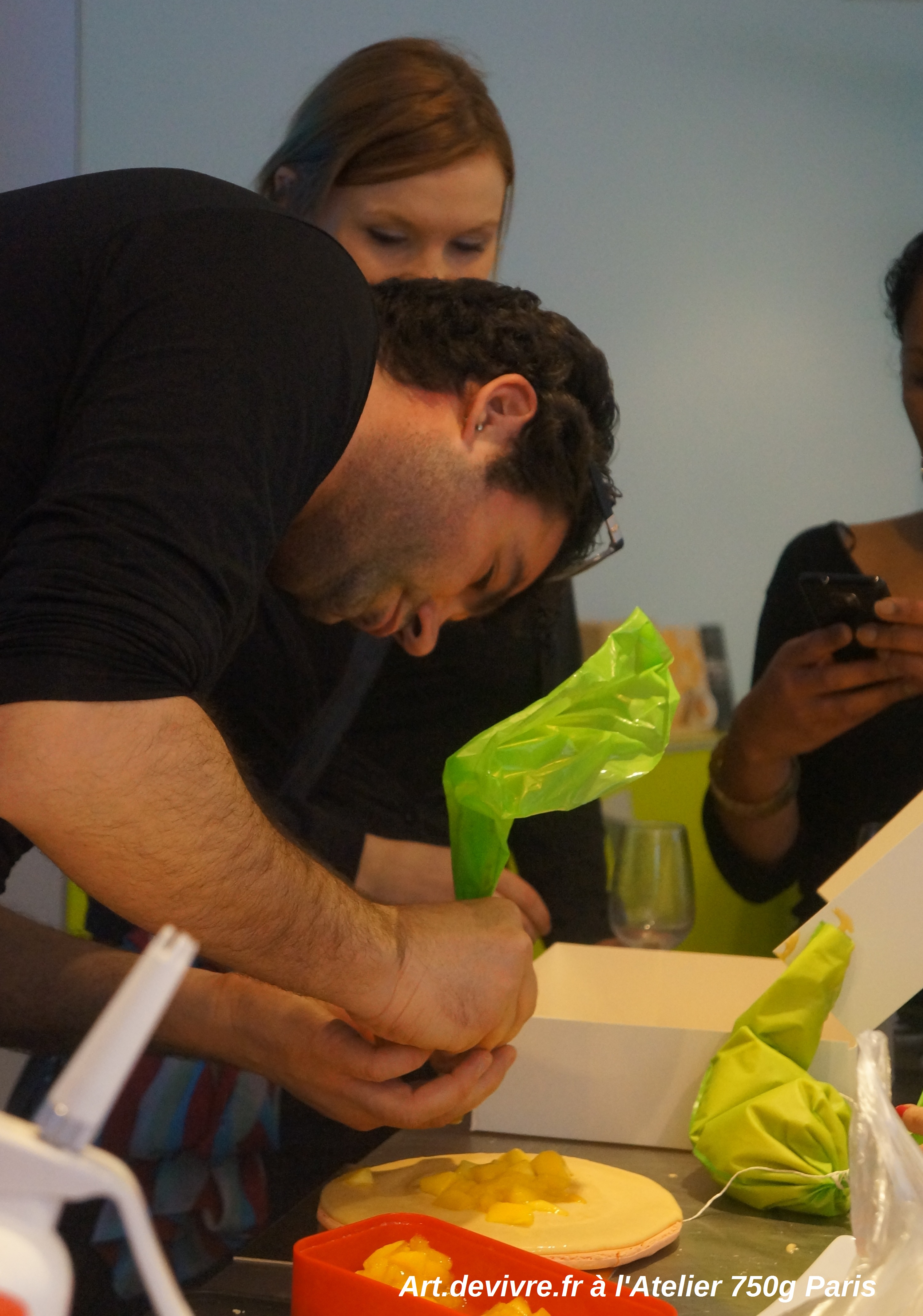 Nicolas du blog SugarNSale sous l'oeil de attentif de sa muse Tatiana prépare un macaron glaçé à la mangue et au caramel au beurre salé.