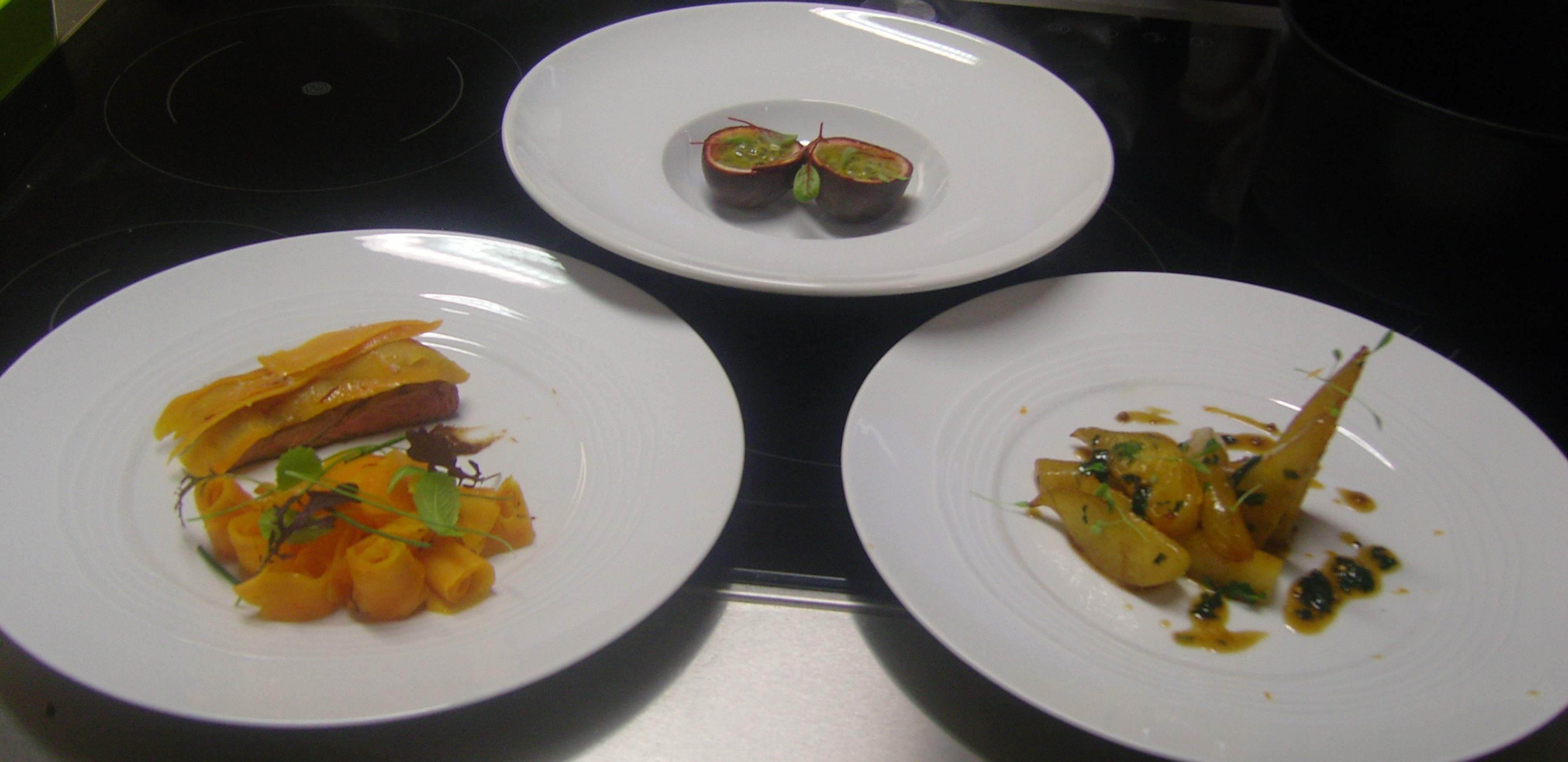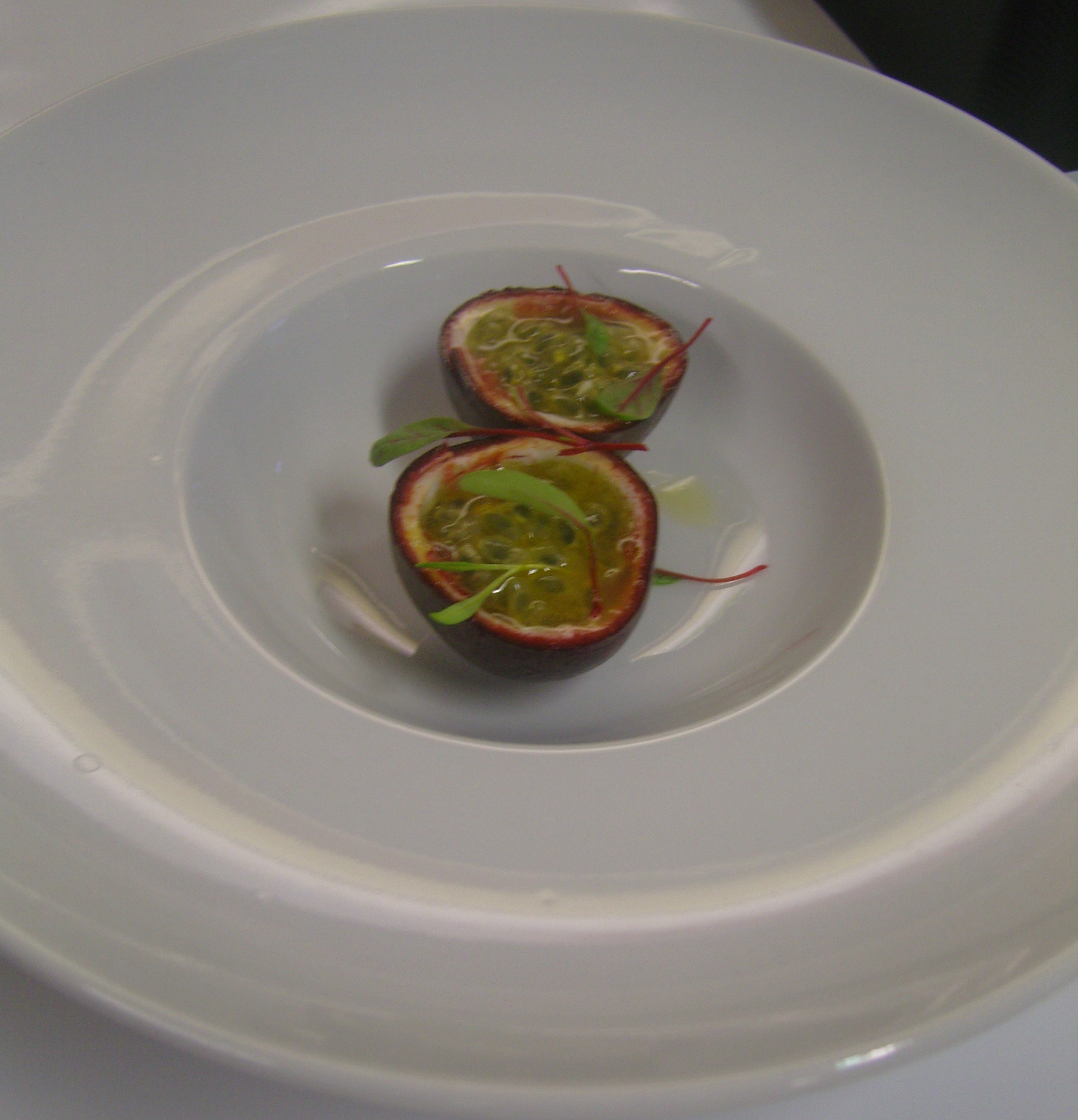 Avec ce jeune chef talentueux cela donne ceci en moins d'une heure ! J'aurais presque pu vous le proposer en devinette. En entrée, des huîtres servies dans la coque des fruits de la passion qui ont servi à faire la sauce. Une belle assiette présentée en trompe l'oeil.