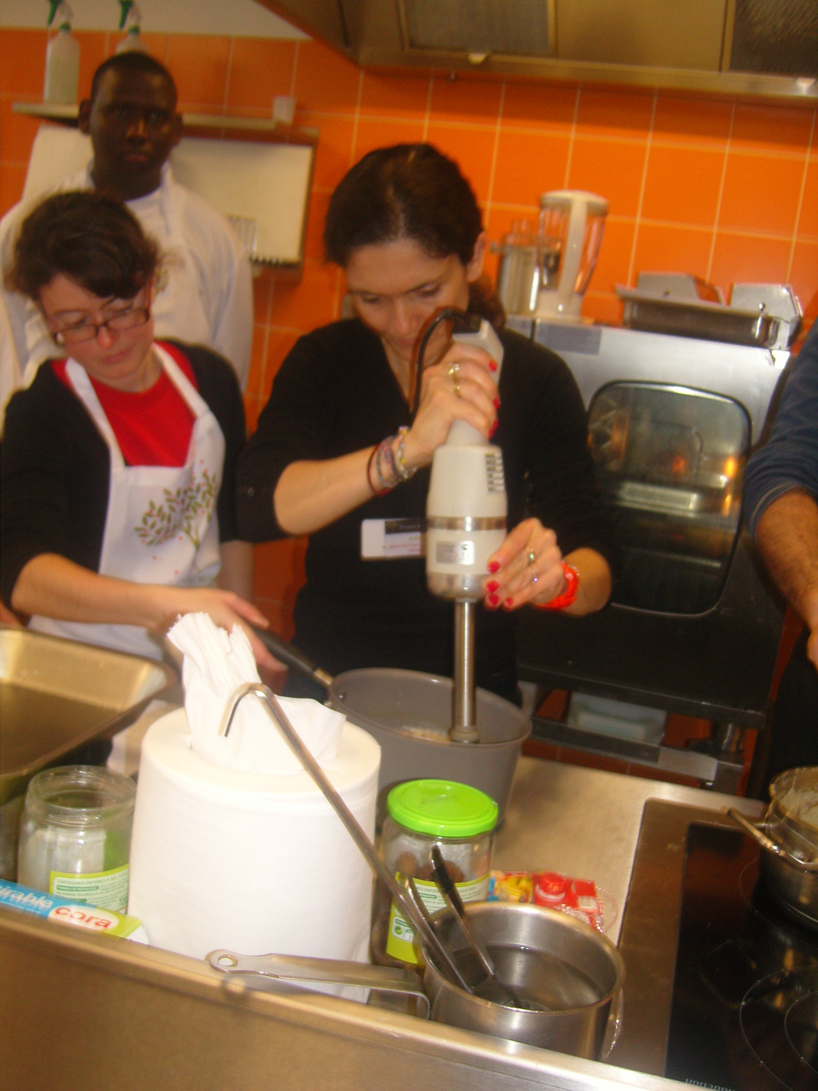 Dorian, lui propose une autre approche à partir de produits simples et abordables du quotidien de réaliser un repas de fête original et plutôt équilibré. Cappucino de marrons au foie gras , Rôti de saumon avec sa purée de céleri à l'orange et enfin une pavlova poire au chocolat ….. Il a su mettre en oeuvre un atelier très interactif, à la fin nous étions plus d'une dizaine à participer. Il a créer sa brigade tout en douceur et bonne humeur. J'ai adoré.