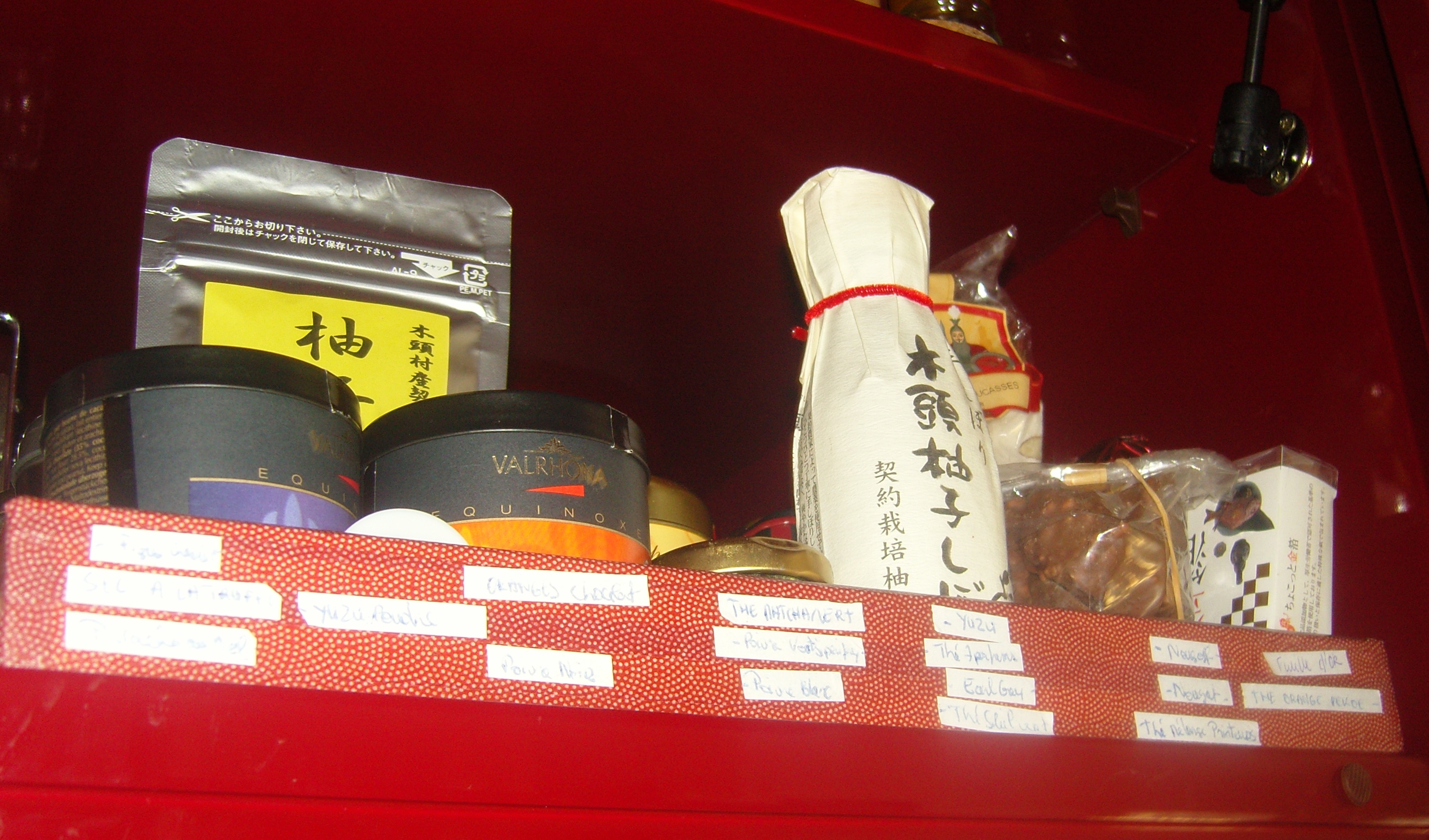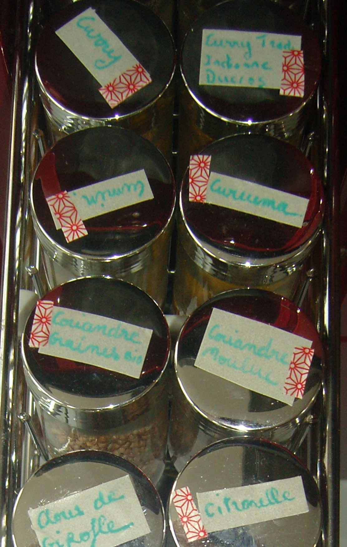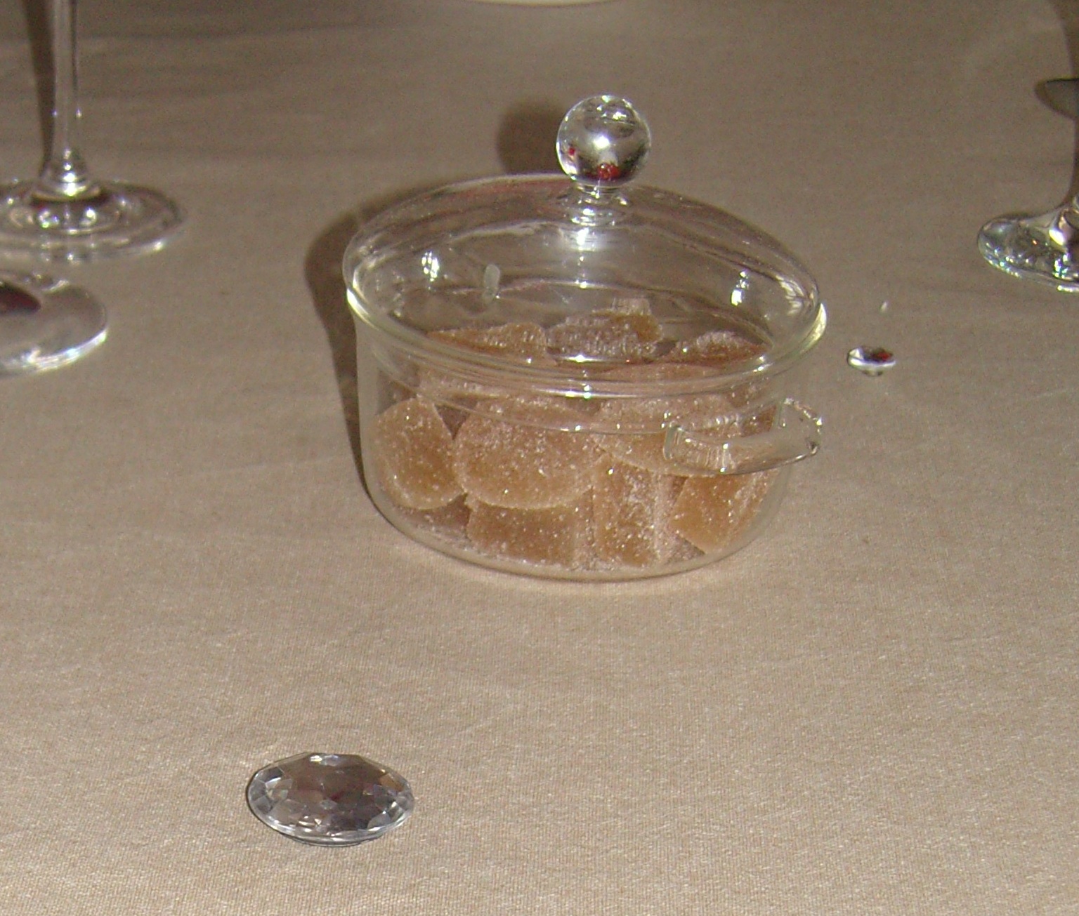 Les pâtes de fruits poires sont mises pour l'occasion dans un contenant transparent. Des sucres ( de canne tout simples) viendront au moment du café compléter le tableau. Avec tous les éléments autour la couleur sucre de canne fait assez dorée. Quelques diamants Les magnets du frigo viennent compléter le décors.