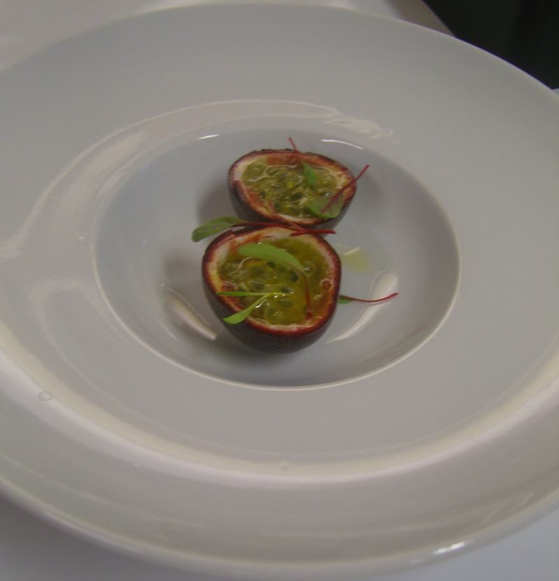 Avec ce jeune chef talentueux cela donne ceci en moins d'une heure ! J'aurais presque pu vous le proposer en devinette. En entrée, des huîtres servies dans la coque des fruits de la passion qui ont servi à faire la sauce. Une belle assiette présentée en trompe l'oeil.