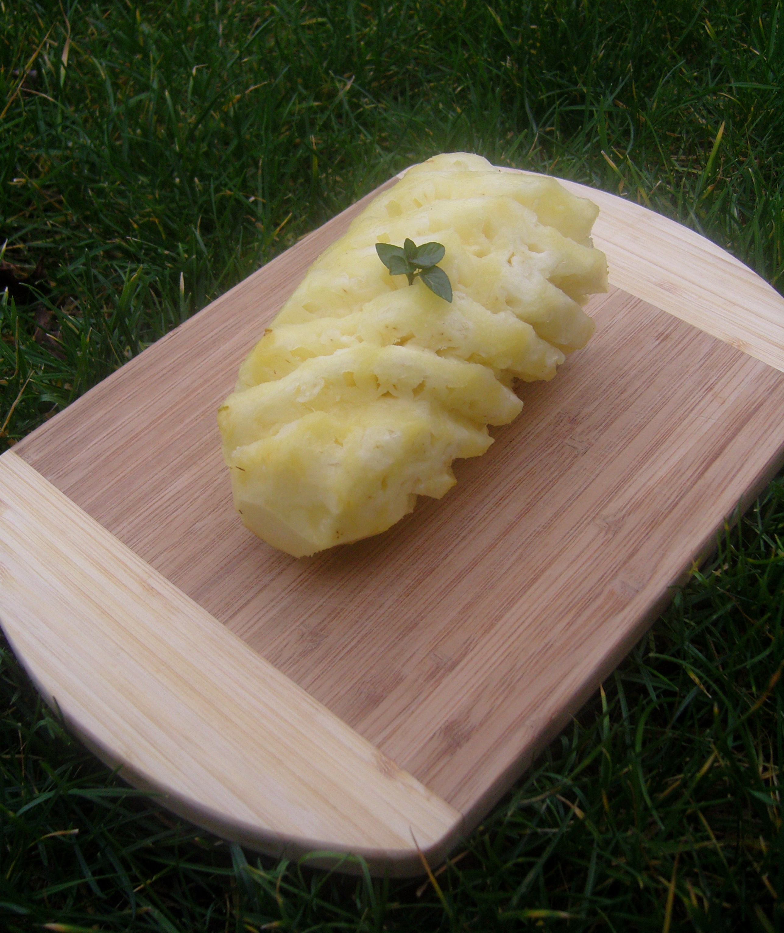 Reste maintenant à pouvoir le déguster sereinement. Il s’épluche moins facilement qu’une pomme. Toutefois j’ai découvert récemment que les mathématiques pouvaient nous y aider. Il suffit d’appliquer la formule suivante z = f(v / u) ! Je ne blague qu’à moitié :-). Les encoches dures de peaux qui restent dans l’ananas peuvent s’enlever facilement si l’on regarde l’ananas autrement. En effet, ces petits points bruns sont disposés en spirale, le terme technique est en Hélicoïde – Schéma explicatif ici – clic – Et là cela devient d’une simplicité enfantine. En moins, de cinq minutes mon ananas est épluché et prêt à être déguster. En plus, je trouve le résultat assez esthétique. Pour faire c’est tout simple et dernièrement c’est devenu notre dessert régulier du soir.