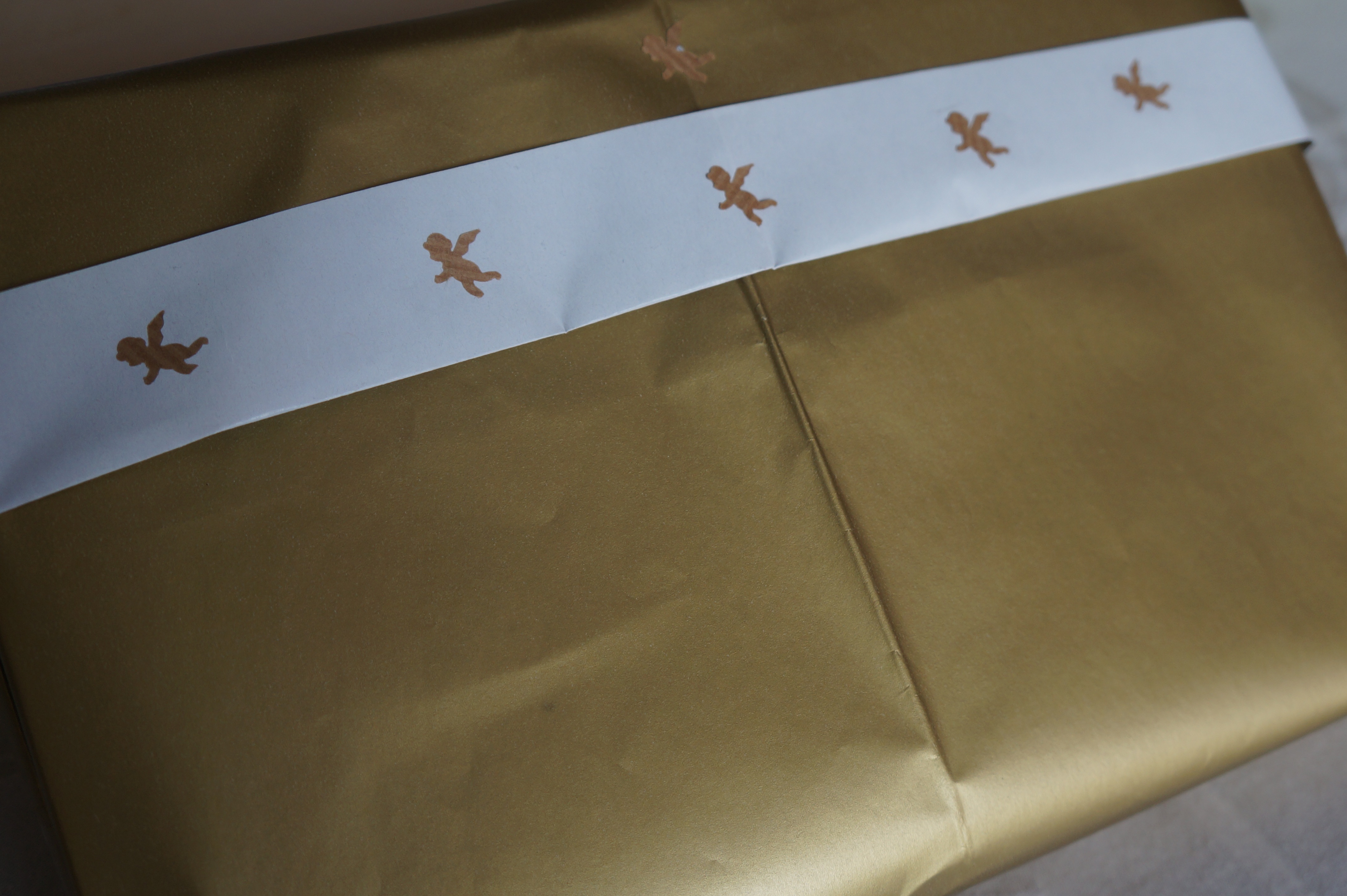 matériel et astuces : ciseaux, papier cadeaux doré, papier kraft, poinçonneuse ange. Le paquet est réalisé classiquement. Sur la bande blanche j'ai juste collé des petits anges réalisés à l'aide d'une perforatrice sur un reste de papier kraft. L'illusion d'optique fait le reste et l'on a l'impression d'angelots dorés sur le paquet.