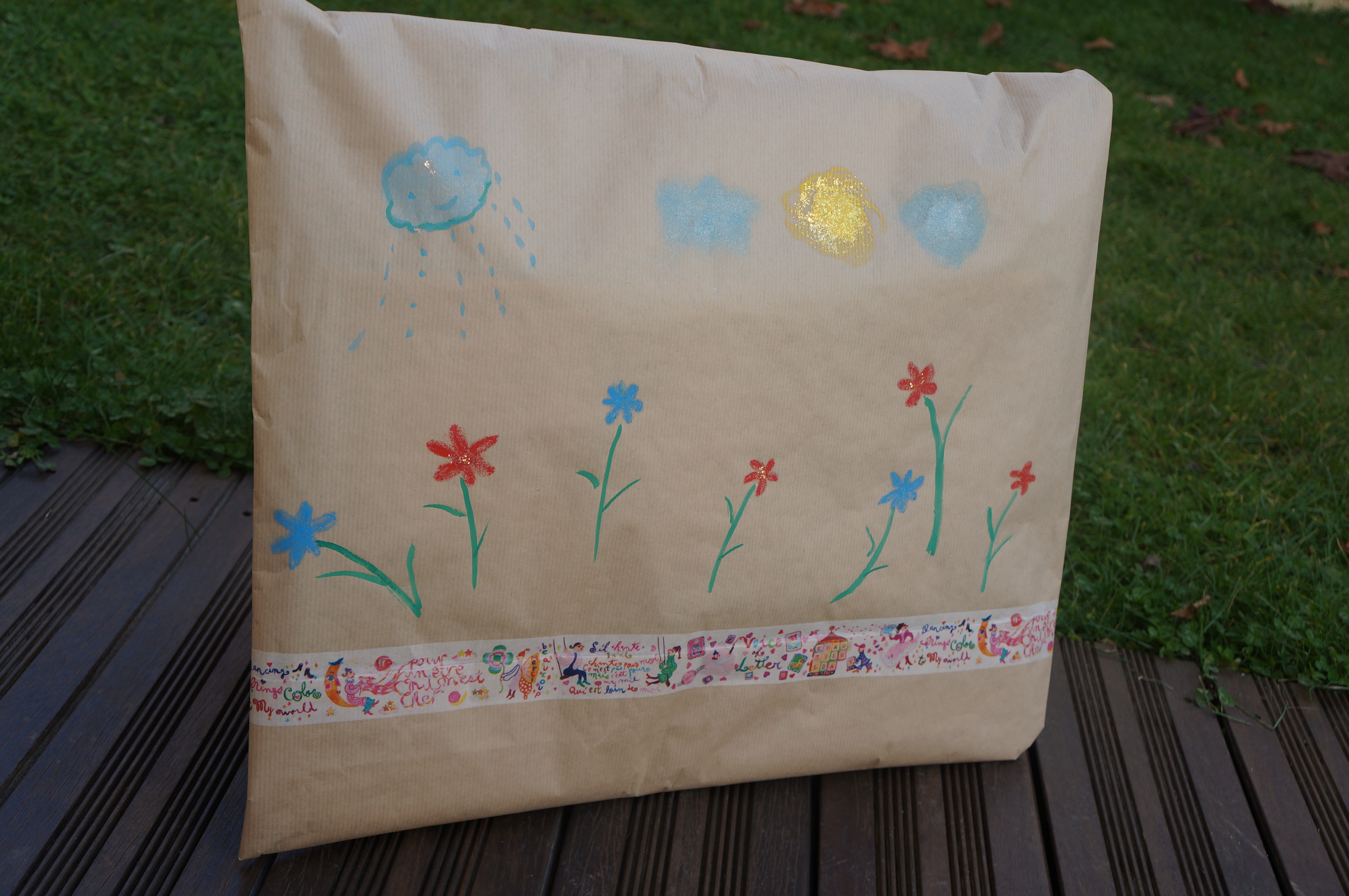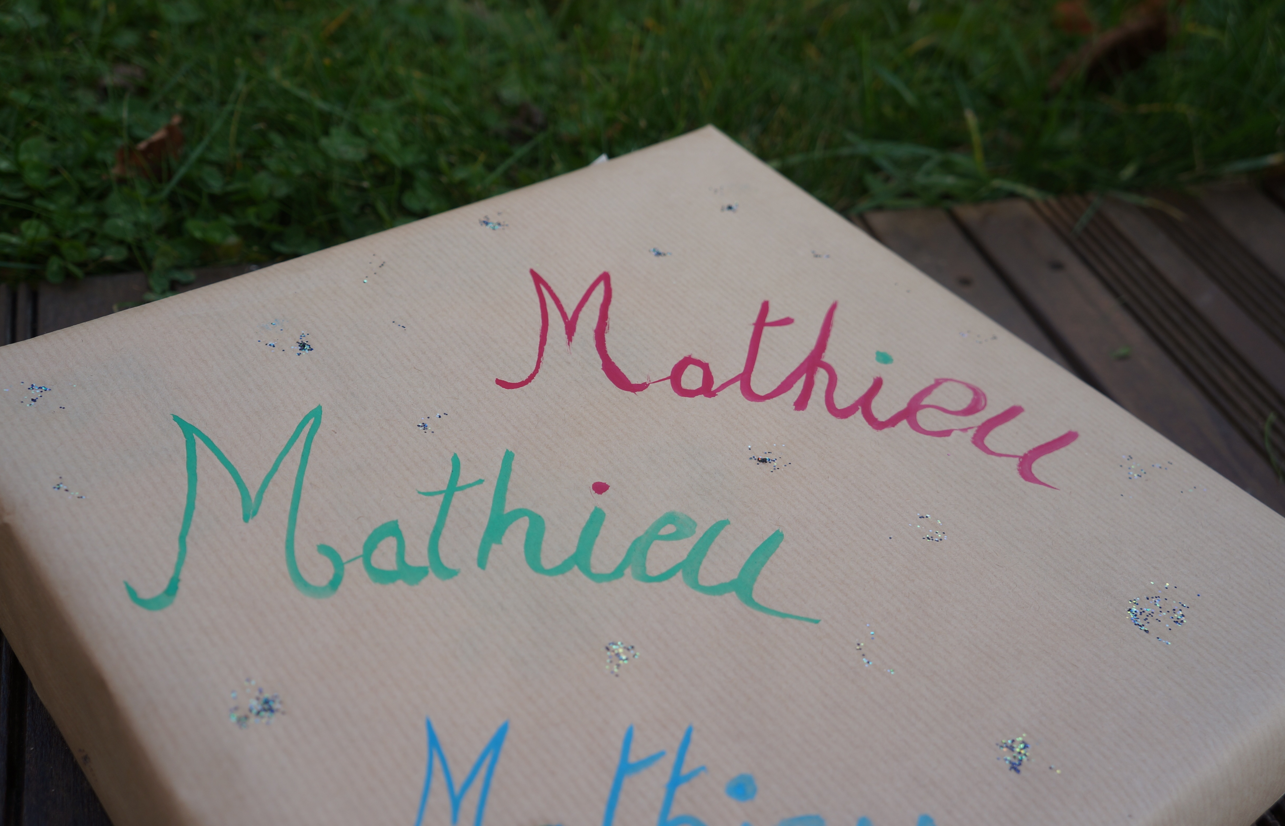 matériel et astuces: Pour les deux premiers paquets in simple papier kraft, du masking tape, ciseaux, paillettes et la peinture à l'eau des enfants étalée un avec un pinceau 10. C'est tout simple mais le papier kraft permet bien des fantaisies. Le prénom inscrits permettant aux enfants de repérer leurs paquets facilement. Quelques paillettes ajoutent une touche de fantaisies qu'ils adorent.