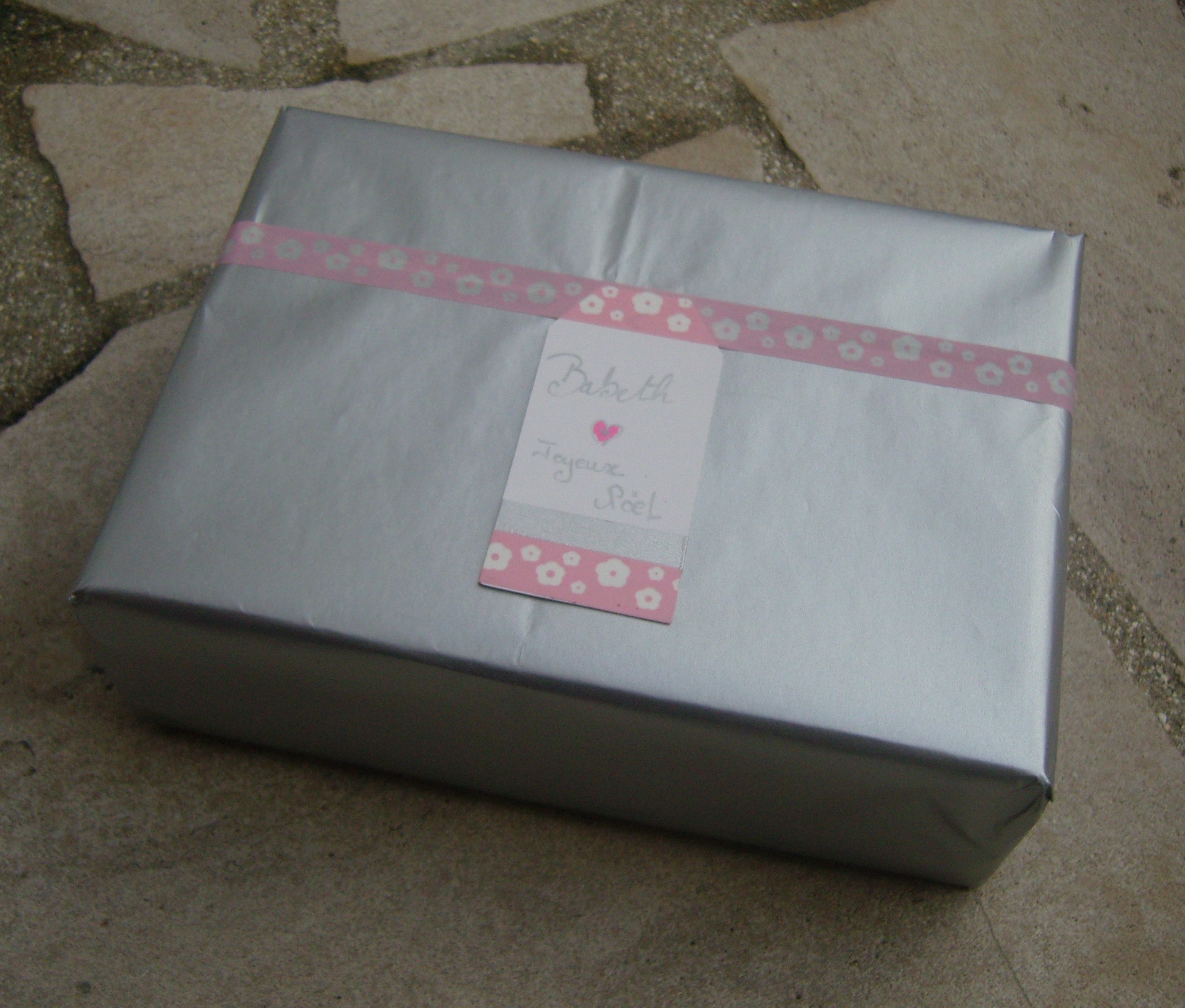 matériel et astuces : masking tape, ciseaux, papier argent, stylo posca argent, étiquette. Paquet réalisé classiquement.Une bande de masking tape est dépsé en décors et elle tient l'étiquette du paquet. Pour que le tout soit assorti la même bande de masking tape est positionnée sur l'étiquette.