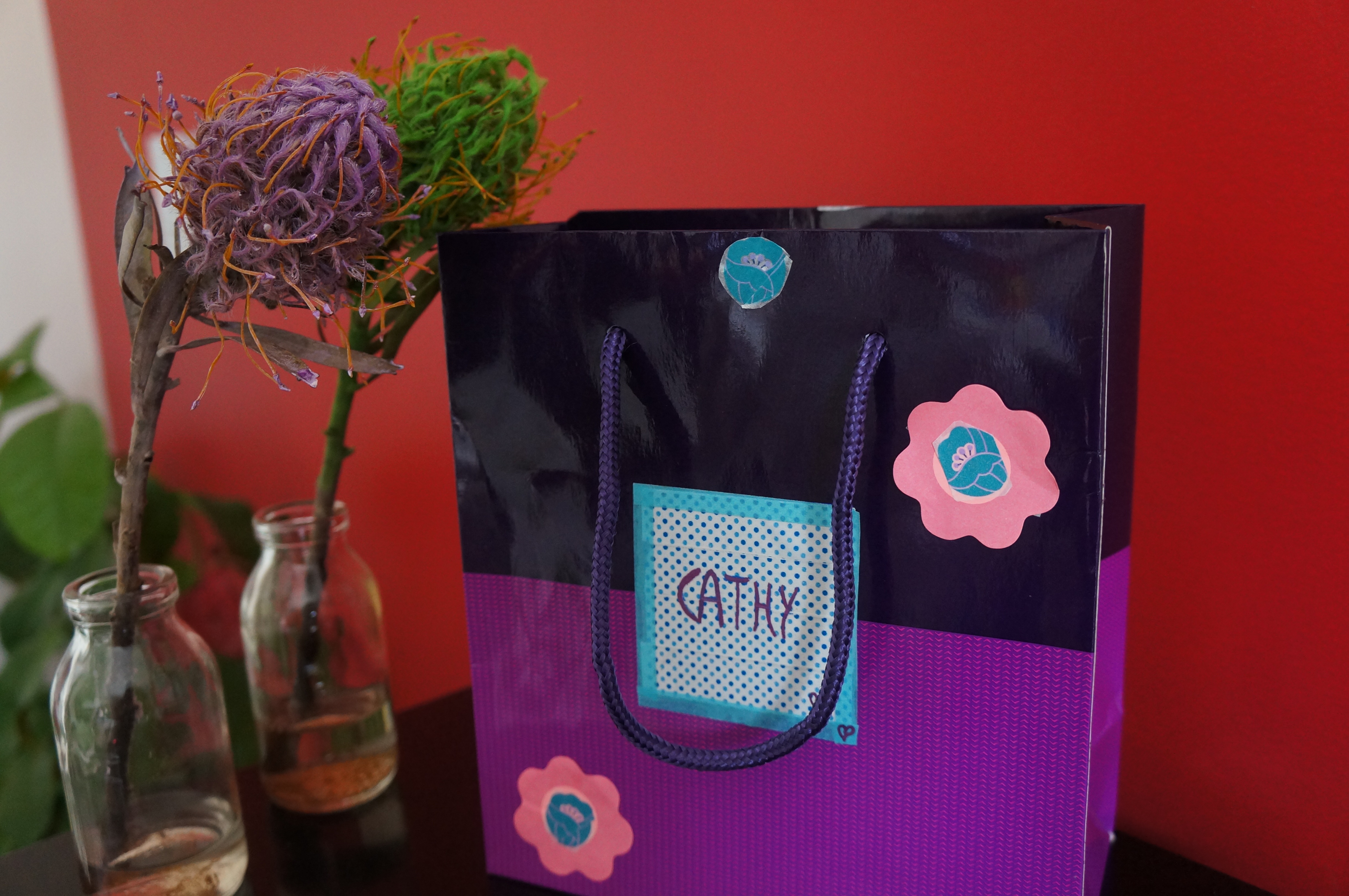 matériel : masking tape, ciseaux, papier cadeaux rose fuschia, bolduc. Prénom est réalisé tout simplement avec du masking tape. L'avantage du masking tape c'est qu'on peut coller et décoller sans abimer le papier du coup cela se réalise sans soucis: -)
